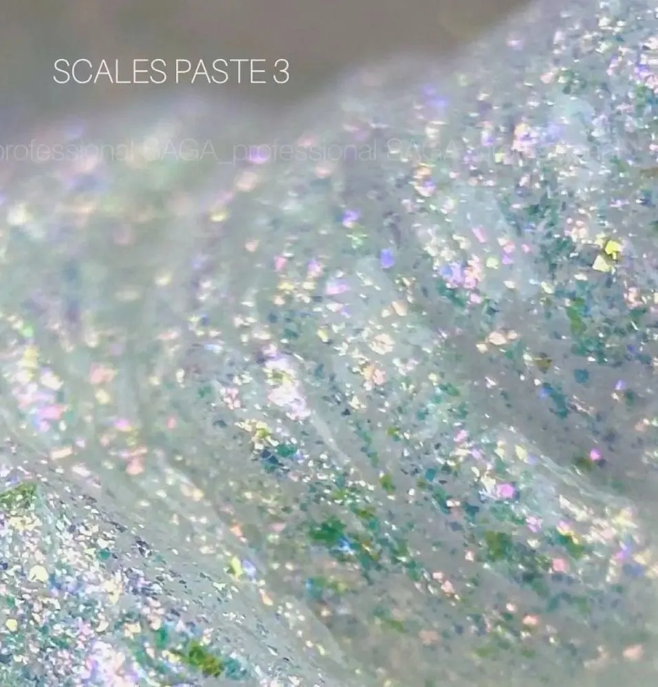 SAGA paste наповнена різнорозмірними блискітками, що нагадують перлинну крихту. Залежно від освітлення частинки переливаються різними відтінками, створюючи перламутровий ефект. Можна застосовувати, щоб робити об`ємні елементи декору: хвилі, краплі, абстракції.