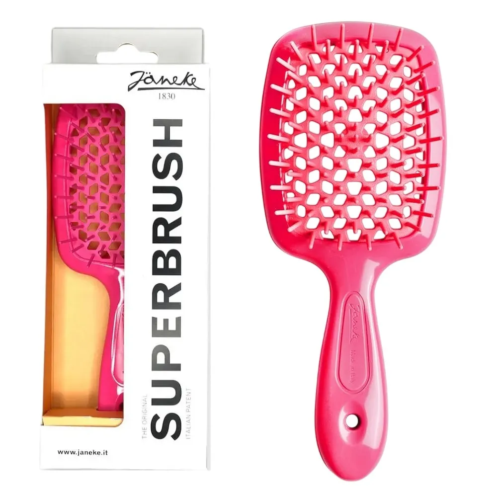 Щітка з м`якими кінчиками для волосся SUPERBRUSH Janeke ніжно та ефективно розплутує волосся, а особлива перфорація у вигляді бджолиного вулика дозволяє дуже швидко його висушити. Ідеально підходить для душу або вологого волосся, що забезпечує рівномірний розподіл доглядових засобів і швидке висихання. Безпечна та дуже зручна для ніжного дитячого волосся, нарощеного, тонкого, густого, ламкого і кучерявого волосся. Пневматична основа щітки має особливу запатентовану перфорацію у вигляді бджолиного вулика. Завдяки цьому гаряче повітря фена розподіляється рівномірно і висушує волосся в кілька прийомів, не навантажуючи його. Особливості продукту: Щітка для волосся продувна ( колір: Неон рожевий ) PINK Standart SUPERBRUSH Janeke Розмір: Standart 21 cм (20,3x8,5x3,1 см).Щітка для волосся продувна Standart SUPERBRUSH Janeke