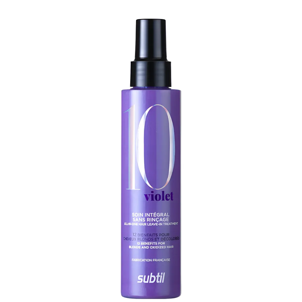 10 VIOLET– комплексний догляд 12 в 1 з миттевою дією для світлого та знебарвленого волосся й нейтралізації небажаних тонів. Ідеально підходить для освітлення світлого волосся та боротьби з небажаними жовтими та помаранчевими тонами. Засіб поєднує в собі ефективність маски, швидкість незмивного засобу та практичність універсального засобу. Має аромат - вишуканий, квітковий, водний та ванільний. Його можна брати з собою всюди для глибокого догляду всього за кілька секунд. Цей багатофункціональний засіб задовольняє 12 потреб світлого та знебарвленого волосся за один крок: Застосування: Спрей-догляд комплексний 12 в 1 для світлого та знебарвленого волосся, 150 мл Soin Integral 10 VIOLET Subtil Підходить для щоденного використання та можна використовувати як на вологому, так і на сухому волоссі. Всього кілька розпилень, і готово! Не змивати. Волосся захищене та легко укладається, без обтяження.Спрей-догляд комплексний 12 в 1 для світлого та знебарвленого волосся Soin Integral 10 VIOLET Subtil