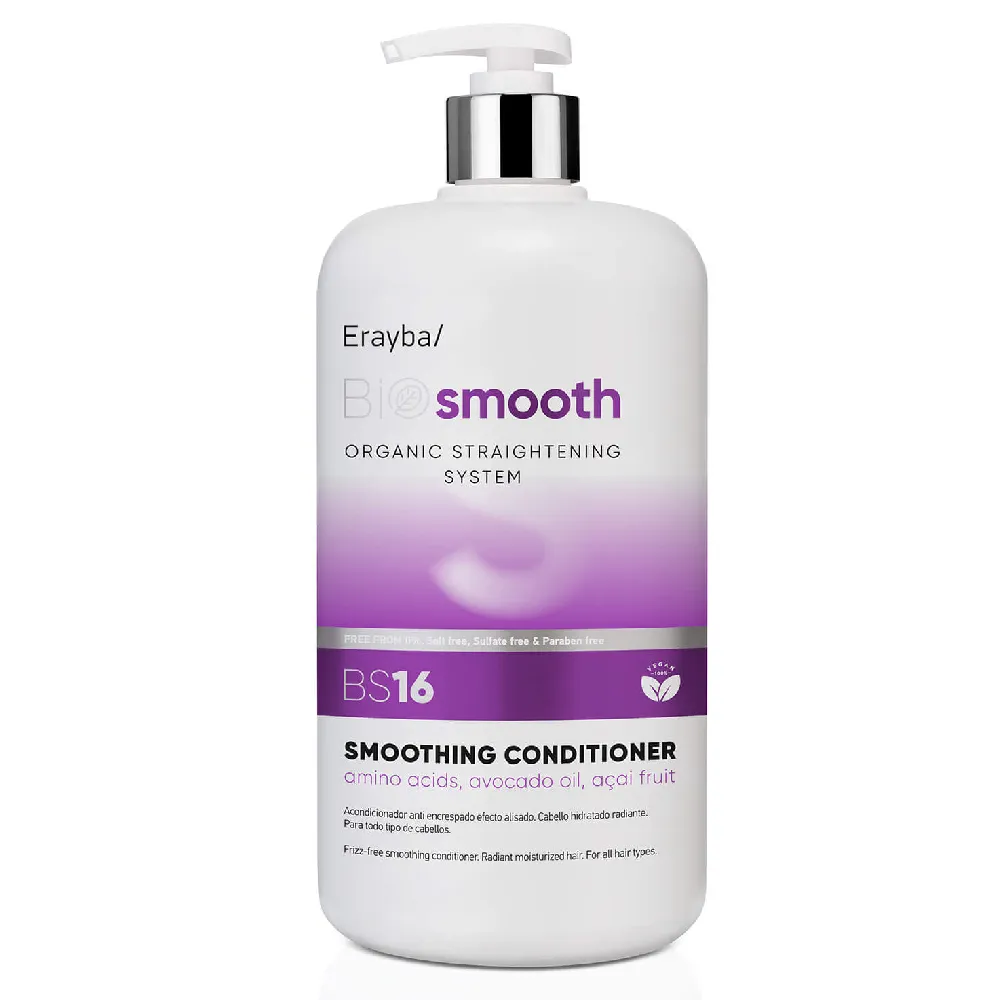 Розгладжуючий кондиціонер Smoothing Conditioner BS16 є багатим джерелом амінокислот і природних активних інгредієнтів. Його унікальна формула на основі натуральних компонентів допомагає зволожувати, живити і розгладжувати волосся, усуваючи пухнастість і надаючи пасмам шовковисту текстуру. Для всіх типів волосся. Сприяє легкому розчісуванню та укладанню волосся. Активні компоненти: амінокислоти, олія авокадо, олія плодів асаї. Особливості продукту: Застосування: вимити волосся шампунем і висушити рушником, масажними рухами нанести кондиціонер за всією довжиною волосся. Залиште діяти на кілька хвилин і змийте.Кондиціонер для вирівнювання курчавого волосся, 250 мл Smoothing Conditioner BS16 BIOsmooth ERAYBA