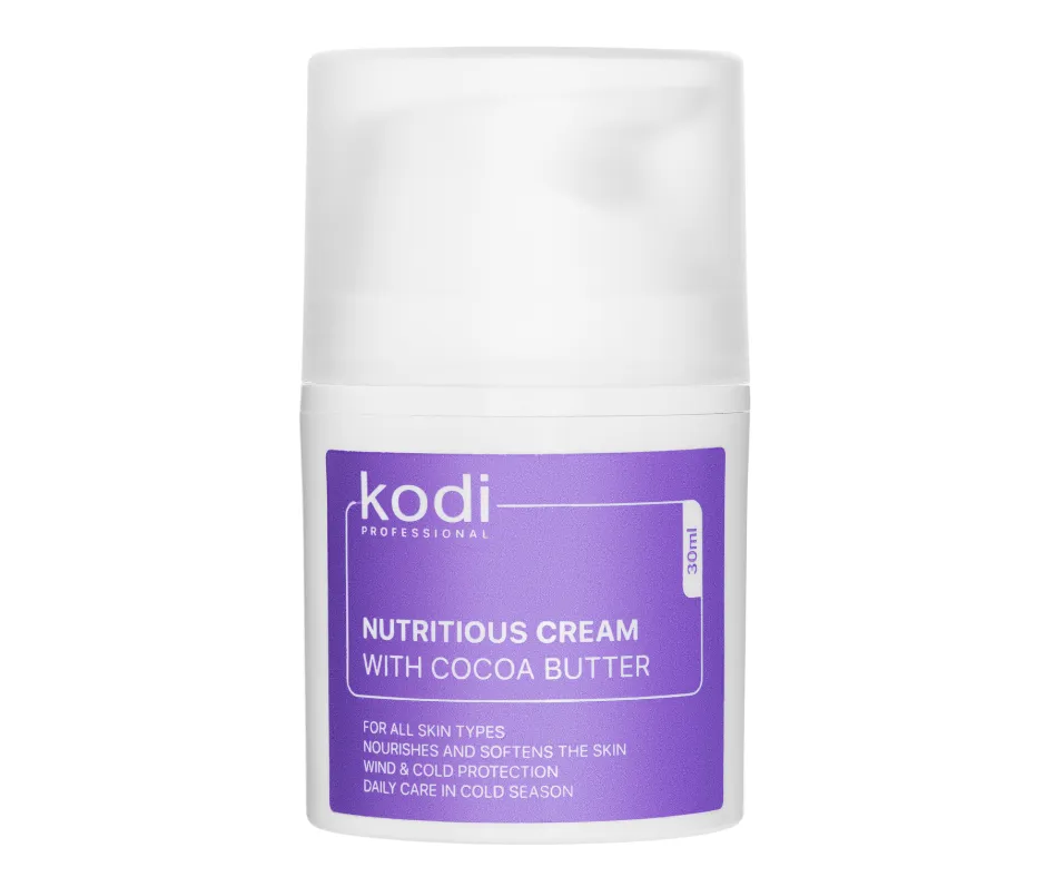 Інтенсивне живлення шкіри — найважливіший фактор догляду, що продовжує молодість і красу. Універсальний живильний крем від бренду Kodi Professional підходить всім типам шкіри і буде особливо актуальним узимку для комплексного захисту епідермісу від негативного впливу зовнішнього середовища. Крем має щільну консистенцію, але легко наноситься на шкіру і добре поглинається, не залишаючи липких слідів. Він має приємний, ненав`язливий аромат, який перетворює доглядову процедуру на справжній спа-сеанс. Формула засобу була посилена натуральною какао-олією, яка інтенсивно живить, зволожує та сприяє регенерації шкіри, зберігаючи її молодість та привабливий зовнішній вигляд. Спосіб використання: рекомендується наносити вранці та ввечері на попередньо очищену шкіру. Немає вікових обмежень. Склад: Aqua, Isopropyl Myristate, Caprylic/Capric Triglyceride, Theobroma Cacao Seed Butter, Cetearyl Alcohol, PEG-20 Stearate, Stearic Acid, Glycerol Monostearate SE, Phenoxyethanol, Lanolin, Dimethicone, Imidazolidinyl Urea, Triethanolamine, Carbomer, Parfum, Ethylhexylglycerin, BHT, Cocoa Powder, CI 19140, CI 42053, CI 16255.Живильний крем для обличчя з олією какао, 30 мл