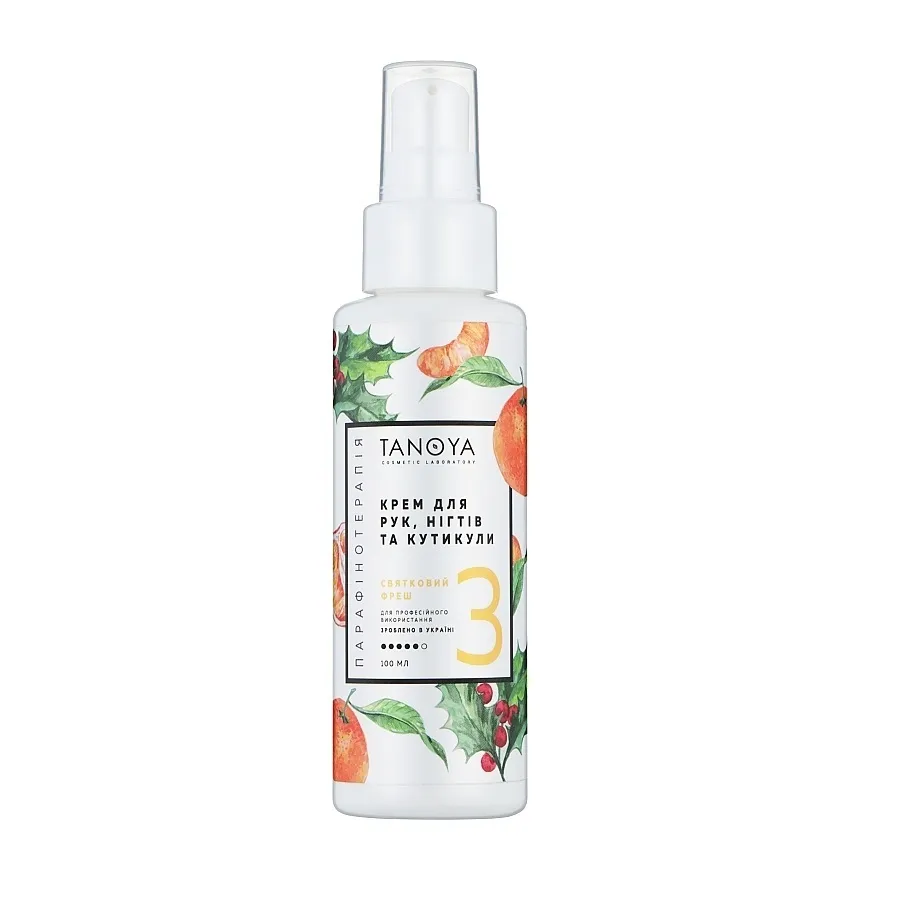 ЕТАП Парафінотерапії: Догляд після процедури та на кожен день. ДІЯ ТА АКТИВНІ КОМПОНЕНТИ ЗАГАЛЬНА ІНФОРМАЦІЯ Унікальна формула, що збагачена природними олiями, забезпечує надійний догляд за шкірою рук та кутикулою, сприяє ЗАСТОСУВАННЯ Легкими масажними рухами нанести невелику кількість крему. ПОРАДА КОСМЕТОЛОГА Цей крем можна використовувати як самостійне доповнення до процедури манікюру, педикюру та щоденного догляду ПРОТИПОКАЗАННЯ Немає.Крем для рук, нігтів та кутикули Лімітований випуск в ароматі «Мандарин» TANOYA Парафінотерапія