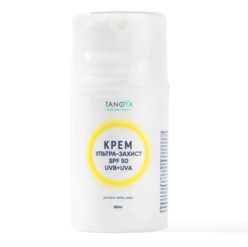 Крем має ніжну текстуру й легко наноситься рівномірним шаром. Живить і зволожує шкіру. Створює РЕКОМЕНДОВАНО: Для живлення і надійного захисту від сонячних опіків, фотостаріння, СКЛАД: Aqua, Ethylhexyl Methoxycinnamate, Diethylamino Hydroxybenzoyl Hexyl Benzoate,Крем ультра-захист SPF 50 для обличчя і тіла всіх типів шкіри