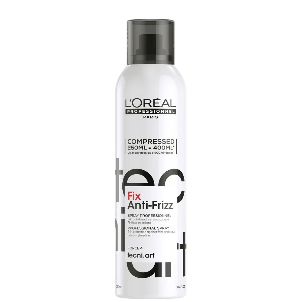 Лак для волосся сильної фіксації з антистатичним ефектом L`oreal Professionnel Tecni.Art Fix Anti-Frizz робить пасма гладенькими та сяючими, водночас позбавляє волосся статичної електрики. Стайлінговий засіб дає змогу виглядати локонам акуратнішими та доглянутими, немов після салону. Із цим б`юті-продуктом укладка залишається ідеальною (без пухнастості та статики), навіть за вітряної та вологої погоди. Водночас засіб не склеює пасма та не створює твердої кірки, залишає зачіску природною та рухливою. Особливості продукту: Лак для волосся сильної фіксації з антистатичним ефектом, 250мл (Force 4) Fix Anti-Frizz Spray Tecni ART L’Oreal Professionnel Застосування: Лак для волосся сильної фіксації з антистатичним ефектом, 250мл (Force 4) Fix Anti-Frizz Spray Tecni ART L’Oreal Professionnel Розпиліть засіб на сухе волосся з відстані 35 см. Для об`єму акуратно розпиліть засіб на корені вашого волосся.Лак для волосся сильної фіксації з антистатичним ефектом (Force 4) Fix Anti-Frizz Spray Tecni ART L’Oreal Professionnel