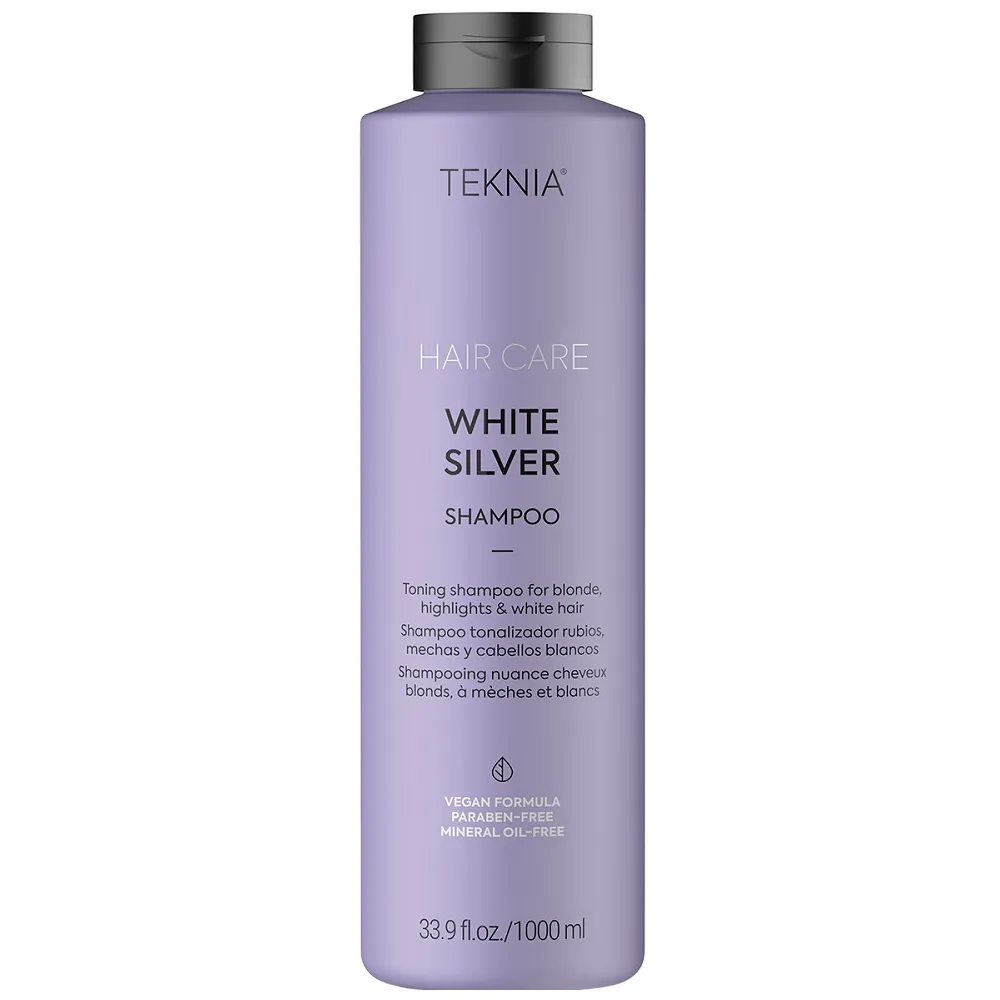 Відгуки Шампунь тонувальний для нейтралізації жовтого відтінку на світлому, мелірованому та сивому волоссі, 1000 мл 44011 Shampoo WHITE SILVER Hair Care TEKNIA LAKME