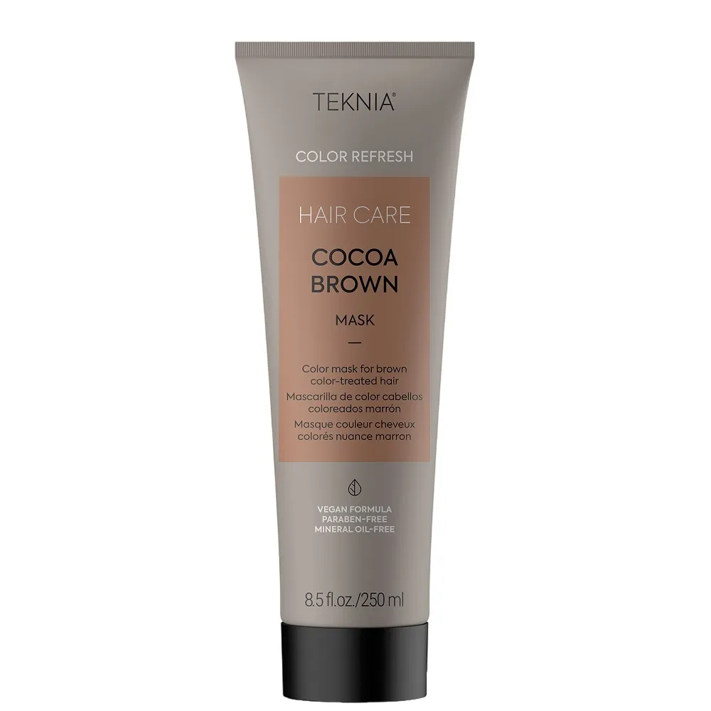 Маска COCOA BROWN MASK інтенсивно відновлює структуру волосся, запобігає втраті пігменту і допомагає надовго зберегти яскравість та інтенсивність кольору. Формула засобу збагачена органічним екстрактом какао, що відрізняється своїми антиоксидантними властивостями. Це додатково захищає локони від негативного впливу зовнішніх факторів, UV-променів і стресу. Має свіжий аромат з ефірною олією лимону. Особливості продукту: Активні компоненти: Застосування: ретельно нанести на вимите та підсушене рушником волосся, залишити мінімально на 5 хвилин, змити.Маска для оновлення кольору коричневих відтінків волосся COCOA BROWN MASK Color Refresh TEKNIA LAKME
