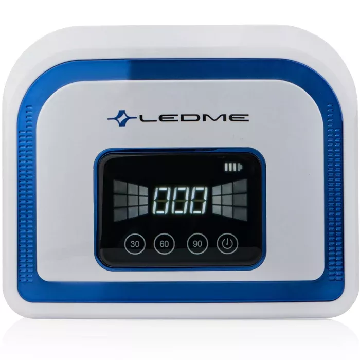 Манікюрна лампа LEDME 5B 120W BLUE з акумулятором Це інноваційна гібридна лампа UV та LED нового покоління. Вона створена для полімеризації гель-лаків (шелак), нарощування нігтів та всіх гелевих покриттів (наприклад, біогель). Ця UV LED лампа ідеально підходить як для домашнього використання, так і для професійних салонів краси. Основною перевагою цієї моделі є можливість роботи від акумулятора. Лампа має слот для акумулятора, який входить у базову комплектацію. Це дуже зручно для майстрів, особливо при раптових відключеннях електроенергії. Час автономної роботи лампи становить близько 60 хвилин (безперервної роботи). Лампа оснащена 30 потужними та безпечними світлодіодами, які забезпечують рівномірне просушування всіх зон на нігтях як під час манікюру, так і педикюру. Ця лампа є безпечною та дуже ефективною. Вона має таймер на 30, 60 та 90 секунд для автоматичного використання. Увімкнення та вимкнення здійснюється через датчик руху, який активується при поміщенні руки всередину лампи. Характеристики: Дисплей: LED-дисплей LED лампа