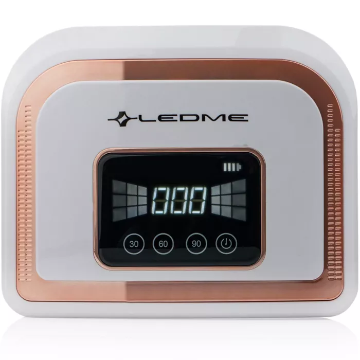Манікюрна лампа LEDME 5B 120W BRONZE з акумулятором Це інноваційна гібридна лампа UV та LED нового покоління. Вона створена для полімеризації гель-лаків (шелак), нарощування нігтів та всіх гелевих покриттів (наприклад, біогель). Ця UV LED лампа ідеально підходить як для домашнього використання, так і для професійних салонів краси. Основною перевагою цієї моделі є можливість роботи від акумулятора. Лампа має слот для акумулятора, який входить у базову комплектацію. Це дуже зручно для майстрів, особливо при раптових відключеннях електроенергії. Час автономної роботи лампи становить близько 60 хвилин (безперервної роботи). Лампа оснащена 30 потужними та безпечними світлодіодами, які забезпечують рівномірне просушування всіх зон на нігтях як під час манікюру, так і педикюру. Ця лампа є безпечною та дуже ефективною. Вона має таймер на 30, 60 та 90 секунд для автоматичного використання. Увімкнення та вимкнення здійснюється через датчик руху, який активується при поміщенні руки всередину лампи. Характеристики: Дисплей: LED-дисплей LED лампа