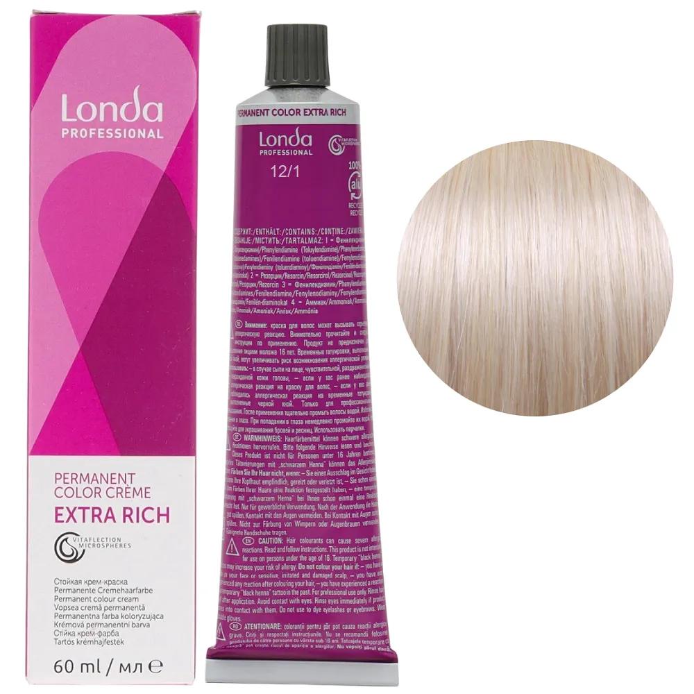 Стійка крем-фарба з мікросферами Vitaflection, які відбивають світло, для стійкого, насиченого життєвою енергією кольору і виняткового блиску волосся. Забезпечує тривалий результат – завдяки спеціальній технології фарба глибоко проникає у структуру волосся, забезпечує інтенсивний колір до 8 тижнів. Має широку палітру понад 100 відтінків для будь-якого типу та кольору волосся. Особливості продукту: 12/1 спеціальний блондин попелястий Стійка фарба для волосся, 60 мл Permanent Color Londa Professional Фарба має престижну систему ароматів з високоякісним маскуванням аміаку, що робить фарбування більш приємним досвідом для вашого клієнта. Застосування: 12/1 спеціальний блондин попелястий Стійка фарба для волосся, 60 мл Permanent Color Londa Professional Змішати фарбу Permanent Color з окислювачем Permanent Hair Colour Developer Londacolor 3%, 6%, 9% або 12%. Пропорції змішування: Час витримки залежить від бажаного результату. Важливо! Продукт для професійного застосування. Уважно ознайомтесь з інструкцією.Стійка фарба для волосся Permanent Color Londa Professional