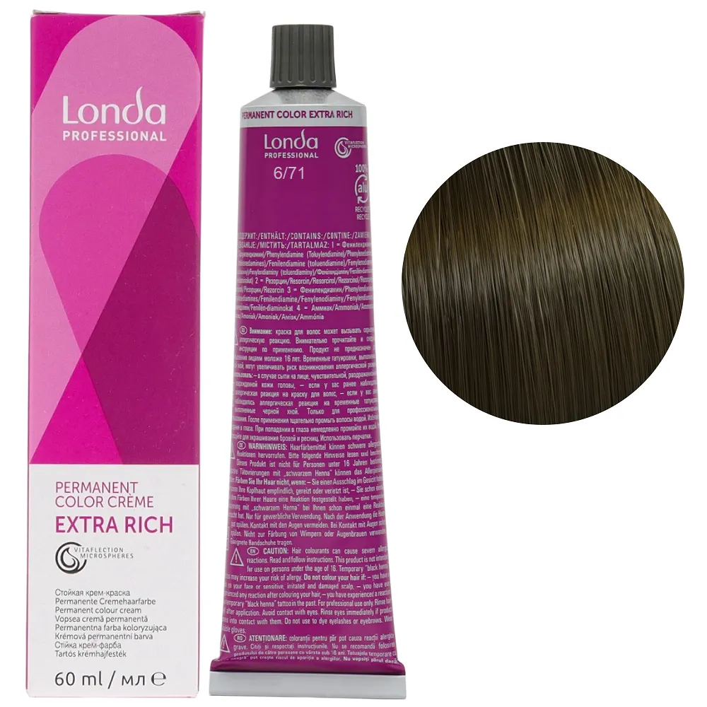 Стійка крем-фарба з мікросферами Vitaflection, які відбивають світло, для стійкого, насиченого життєвою енергією кольору і виняткового блиску волосся. Забезпечує тривалий результат – завдяки спеціальній технології фарба глибоко проникає у структуру волосся, забезпечує інтенсивний колір до 8 тижнів. Має широку палітру понад 100 відтінків для будь-якого типу та кольору волосся. Особливості продукту: 6/71 темний блондин коричнево-попелястий Стійка фарба для волосся, 60 мл Permanent Color Londa Professional Фарба має престижну систему ароматів з високоякісним маскуванням аміаку, що робить фарбування більш приємним досвідом для вашого клієнта. Застосування: 6/71 темний блондин коричнево-попелястий Стійка фарба для волосся, 60 мл Permanent Color Londa Professional Змішати фарбу Permanent Color з окислювачем Permanent Hair Colour Developer Londacolor 3%, 6%, 9% або 12%. Пропорції змішування: Час витримки залежить від бажаного результату. Важливо! Продукт для професійного застосування. Уважно ознайомтесь з інструкцією.Стійка фарба для волосся Permanent Color Londa Professional