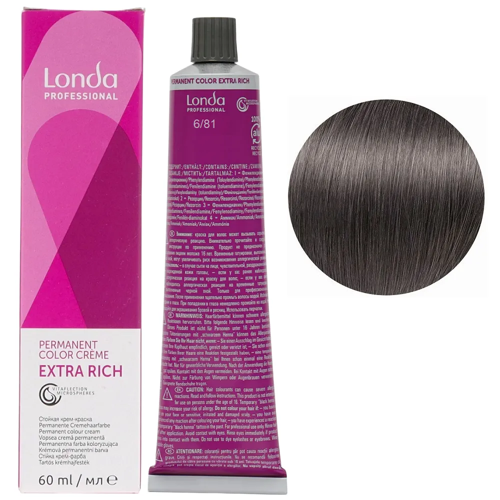 Стійка крем-фарба з мікросферами Vitaflection, які відбивають світло, для стійкого, насиченого життєвою енергією кольору і виняткового блиску волосся. Забезпечує тривалий результат – завдяки спеціальній технології фарба глибоко проникає у структуру волосся, забезпечує інтенсивний колір до 8 тижнів. Має широку палітру понад 100 відтінків для будь-якого типу та кольору волосся. Особливості продукту: 6/81 темний блондин перлинно-попелястий Стійка фарба для волосся, 60 мл Permanent Color Londa Professional Фарба має престижну систему ароматів з високоякісним маскуванням аміаку, що робить фарбування більш приємним досвідом для вашого клієнта. Застосування: 6/81 темний блондин перлинно-попелястий Стійка фарба для волосся, 60 мл Permanent Color Londa Professional Змішати фарбу Permanent Color з окислювачем Permanent Hair Colour Developer Londacolor 3%, 6%, 9% або 12%. Пропорції змішування: Час витримки залежить від бажаного результату. Важливо! Продукт для професійного застосування. Уважно ознайомтесь з інструкцією.Стійка фарба для волосся Permanent Color Londa Professional