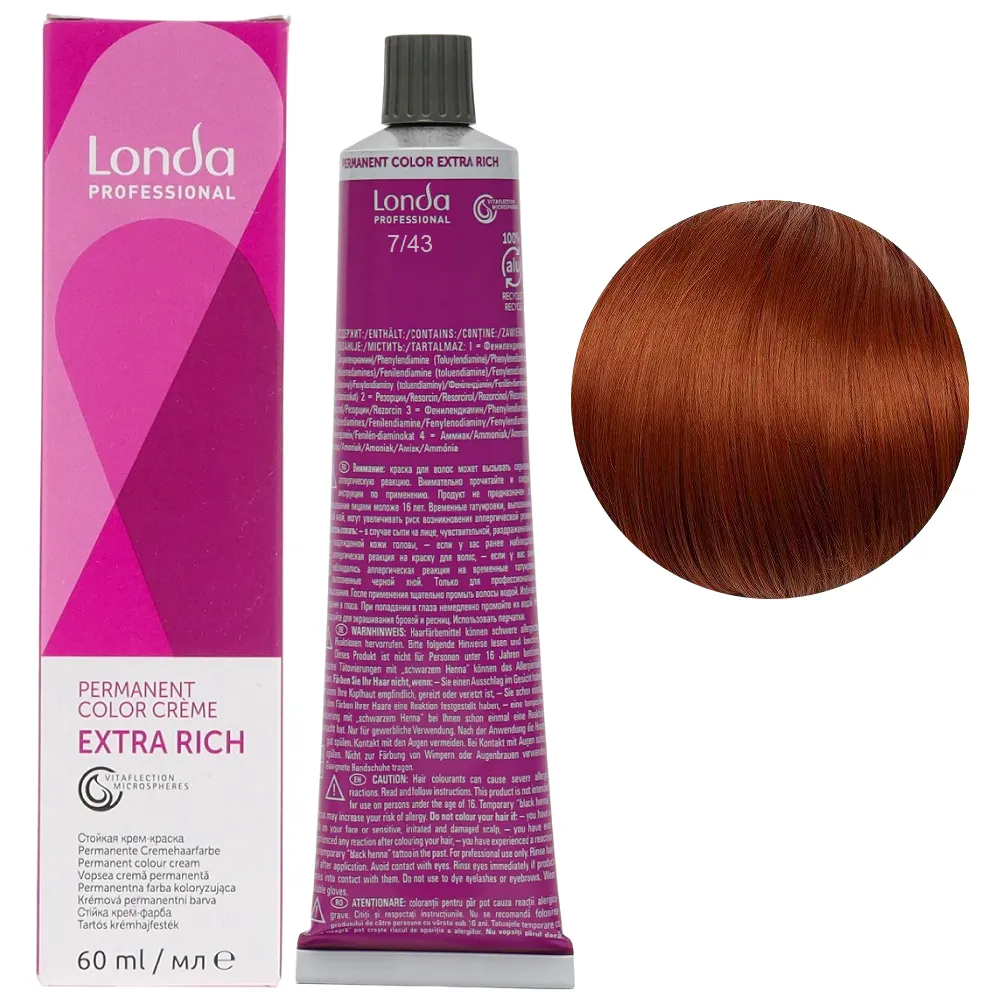 Стійка крем-фарба з мікросферами Vitaflection, які відбивають світло, для стійкого, насиченого життєвою енергією кольору і виняткового блиску волосся. Забезпечує тривалий результат – завдяки спеціальній технології фарба глибоко проникає у структуру волосся, забезпечує інтенсивний колір до 8 тижнів. Має широку палітру понад 100 відтінків для будь-якого типу та кольору волосся. Особливості продукту: 7/43 середній блондин мідно-золотистий Стійка фарба для волосся, 60 мл Permanent Color Londa Professional Фарба має престижну систему ароматів з високоякісним маскуванням аміаку, що робить фарбування більш приємним досвідом для вашого клієнта. Застосування: 7/43 середній блондин мідно-золотистий Стійка фарба для волосся, 60 мл Permanent Color Londa Professional Змішати фарбу Permanent Color з окислювачем Permanent Hair Colour Developer Londacolor 3%, 6%, 9% або 12%. Пропорції змішування: Час витримки залежить від бажаного результату. Важливо! Продукт для професійного застосування. Уважно ознайомтесь з інструкцією.Стійка фарба для волосся Permanent Color Londa Professional