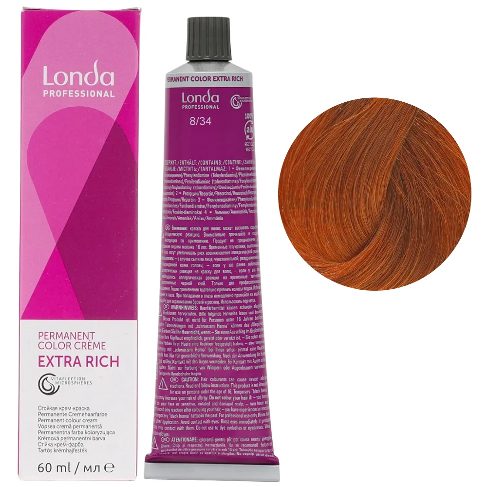 Стійка крем-фарба з мікросферами Vitaflection, які відбивають світло, для стійкого, насиченого життєвою енергією кольору і виняткового блиску волосся. Забезпечує тривалий результат – завдяки спеціальній технології фарба глибоко проникає у структуру волосся, забезпечує інтенсивний колір до 8 тижнів. Має широку палітру понад 100 відтінків для будь-якого типу та кольору волосся. Особливості продукту: 8/34 світлий блондин золотисто-мідний Стійка фарба для волосся, 60 мл Permanent Color Londa Professional Фарба має престижну систему ароматів з високоякісним маскуванням аміаку, що робить фарбування більш приємним досвідом для вашого клієнта. Застосування: 8/34 світлий блондин золотисто-мідний Стійка фарба для волосся, 60 мл Permanent Color Londa Professional Змішати фарбу Permanent Color з окислювачем Permanent Hair Colour Developer Londacolor 3%, 6%, 9% або 12%. Пропорції змішування: Час витримки залежить від бажаного результату. Важливо! Продукт для професійного застосування. Уважно ознайомтесь з інструкцією.Стійка фарба для волосся Permanent Color Londa Professional