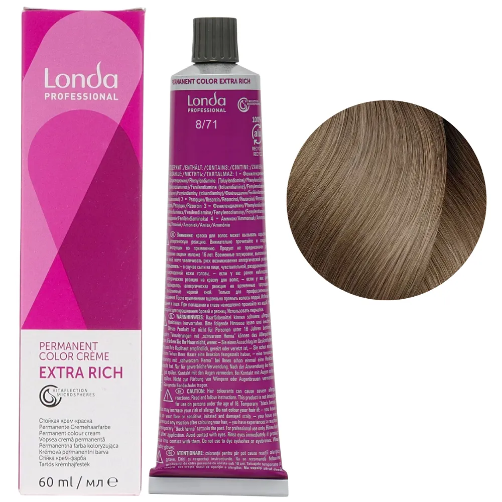 Стійка крем-фарба з мікросферами Vitaflection, які відбивають світло, для стійкого, насиченого життєвою енергією кольору і виняткового блиску волосся. Забезпечує тривалий результат – завдяки спеціальній технології фарба глибоко проникає у структуру волосся, забезпечує інтенсивний колір до 8 тижнів. Має широку палітру понад 100 відтінків для будь-якого типу та кольору волосся. Особливості продукту: 8/71 світлий блондин коричнево-попелястий Стійка фарба для волосся, 60 мл Permanent Color Londa Professional Фарба має престижну систему ароматів з високоякісним маскуванням аміаку, що робить фарбування більш приємним досвідом для вашого клієнта. Застосування: 8/71 світлий блондин коричнево-попелястий Стійка фарба для волосся, 60 мл Permanent Color Londa Professional Змішати фарбу Permanent Color з окислювачем Permanent Hair Colour Developer Londacolor 3%, 6%, 9% або 12%. Пропорції змішування: Час витримки залежить від бажаного результату. Важливо! Продукт для професійного застосування. Уважно ознайомтесь з інструкцією.Стійка фарба для волосся Permanent Color Londa Professional