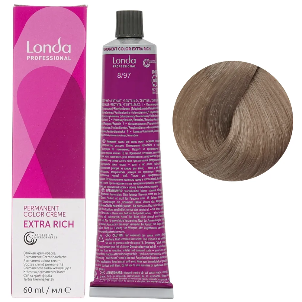 Стійка крем-фарба з мікросферами Vitaflection, які відбивають світло, для стійкого, насиченого життєвою енергією кольору і виняткового блиску волосся. Забезпечує тривалий результат – завдяки спеціальній технології фарба глибоко проникає у структуру волосся, забезпечує інтенсивний колір до 8 тижнів. Має широку палітру понад 100 відтінків для будь-якого типу та кольору волосся. Особливості продукту: 8/97 світлий блондин сандре коричневий Стійка фарба для волосся, 60 мл Permanent Color Londa Professional Фарба має престижну систему ароматів з високоякісним маскуванням аміаку, що робить фарбування більш приємним досвідом для вашого клієнта. Застосування: 8/97 світлий блондин сандре коричневий Стійка фарба для волосся, 60 мл Permanent Color Londa Professional Змішати фарбу Permanent Color з окислювачем Permanent Hair Colour Developer Londacolor 3%, 6%, 9% або 12%. Пропорції змішування: Час витримки залежить від бажаного результату. Важливо! Продукт для професійного застосування. Уважно ознайомтесь з інструкцією.Стійка фарба для волосся Permanent Color Londa Professional