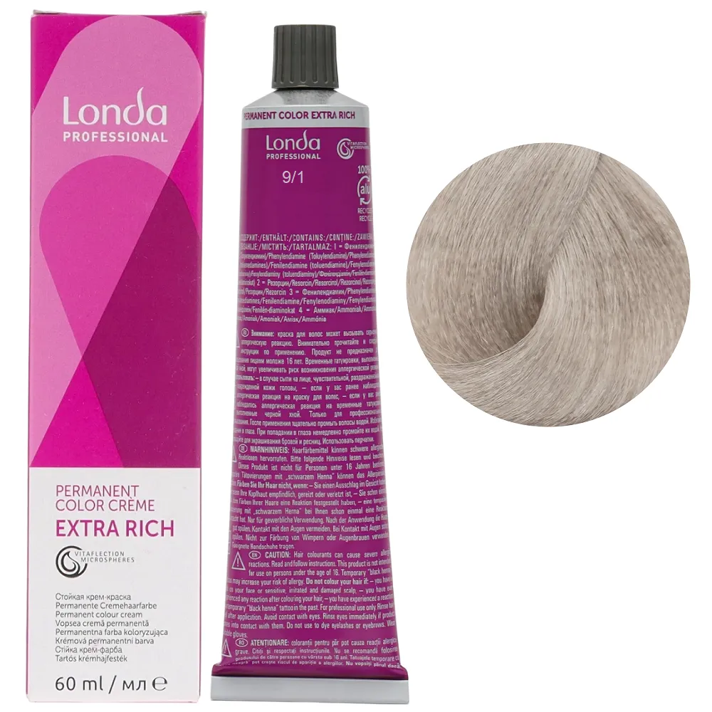 Стійка крем-фарба з мікросферами Vitaflection, які відбивають світло, для стійкого, насиченого життєвою енергією кольору і виняткового блиску волосся. Забезпечує тривалий результат – завдяки спеціальній технології фарба глибоко проникає у структуру волосся, забезпечує інтенсивний колір до 8 тижнів. Має широку палітру понад 100 відтінків для будь-якого типу та кольору волосся. Особливості продукту: 9/1 дуже світлий блондин попелястий Стійка фарба для волосся, 60 мл Permanent Color Londa Professional Фарба має престижну систему ароматів з високоякісним маскуванням аміаку, що робить фарбування більш приємним досвідом для вашого клієнта. Застосування: 9/1 дуже світлий блондин попелястий Стійка фарба для волосся, 60 мл Permanent Color Londa Professional Змішати фарбу Permanent Color з окислювачем Permanent Hair Colour Developer Londacolor 3%, 6%, 9% або 12%. Пропорції змішування: Час витримки залежить від бажаного результату. Важливо! Продукт для професійного застосування. Уважно ознайомтесь з інструкцією.Стійка фарба для волосся Permanent Color Londa Professional