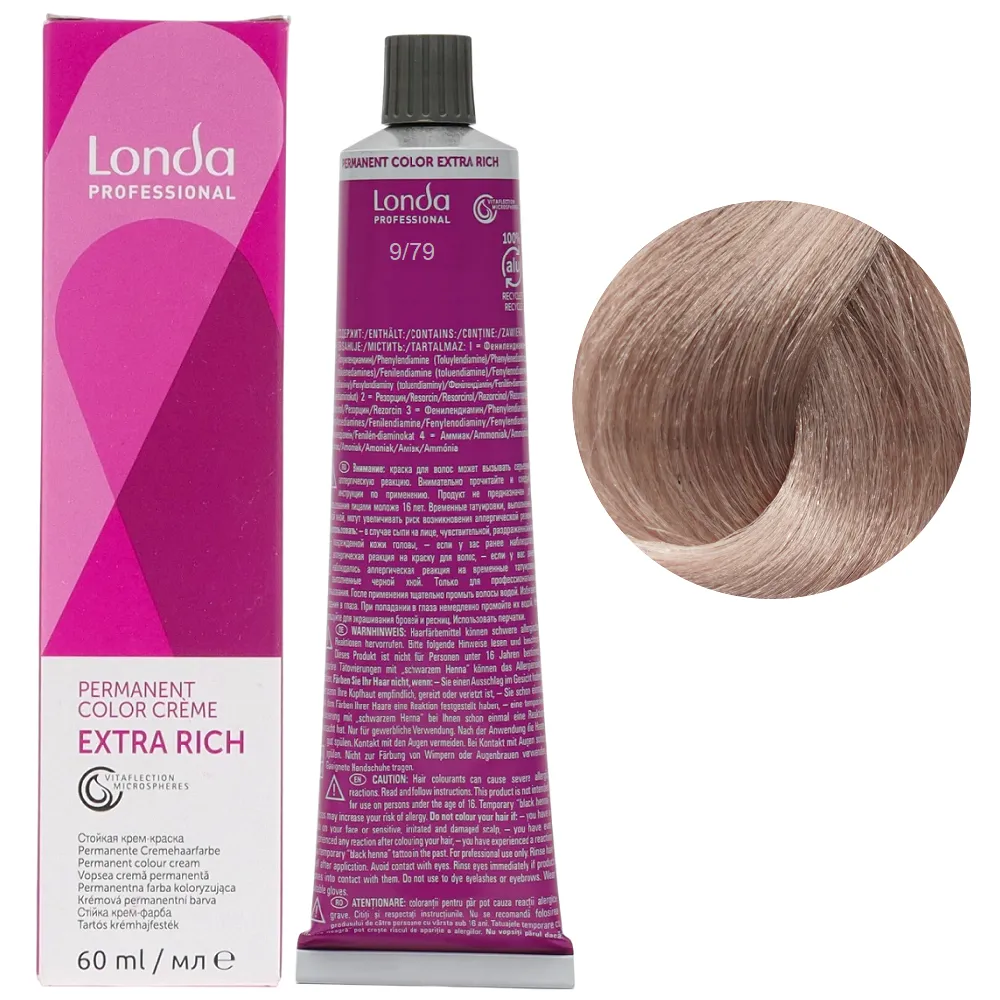 Стійка крем-фарба з мікросферами Vitaflection, які відбивають світло, для стійкого, насиченого життєвою енергією кольору і виняткового блиску волосся. Забезпечує тривалий результат – завдяки спеціальній технології фарба глибоко проникає у структуру волосся, забезпечує інтенсивний колір до 8 тижнів. Має широку палітру понад 100 відтінків для будь-якого типу та кольору волосся. Особливості продукту: 9/79 дуже світлий блондин коричневий сандре Стійка фарба для волосся, 60 мл Permanent Color Londa Professional Фарба має престижну систему ароматів з високоякісним маскуванням аміаку, що робить фарбування більш приємним досвідом для вашого клієнта. Застосування: 9/79 дуже світлий блондин коричневий сандре Стійка фарба для волосся, 60 мл Permanent Color Londa Professional Змішати фарбу Permanent Color з окислювачем Permanent Hair Colour Developer Londacolor 3%, 6%, 9% або 12%. Пропорції змішування: Час витримки залежить від бажаного результату. Важливо! Продукт для професійного застосування. Уважно ознайомтесь з інструкцією.Стійка фарба для волосся Permanent Color Londa Professional