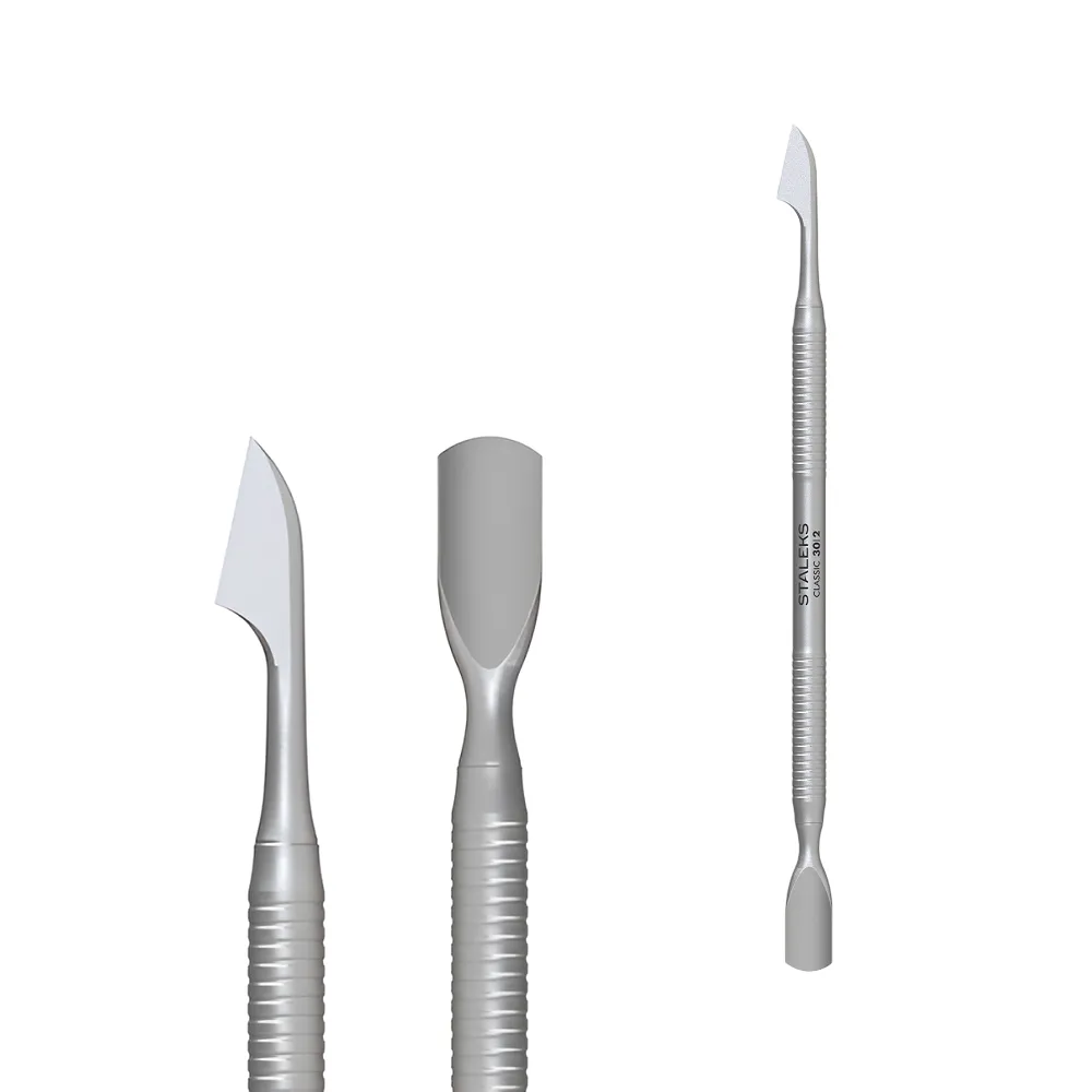 Пушер із сокиркою PC-30/2 розроблений для домашнього застосування. Інструмент поєднує дві функціональні зони: з одного боку розташована заокруглена лопатка вузька, призначена для підняття і відсування кутикули. Її розмір комфортний для обробки невеликих за розміром нігтьових пластин. З іншого боку розміщена робоча частина сокирка, яка очищає нігтьову пластину від птеригію. Завдяки якісному ручному двосторонньому заточуванню інструмент легко справляється зі щільною шкіркою, не пошкоджуючи структуру нігтя. Пушер виконаний з цільного металевого полотна, без ризику розхитування деталей і поломки кріплень. Особливості продукту: Лопатка манікюрна CLASSIC 30 TYPE 2 STALEKS Лопатка манікюрна CLASSIC 30 TYPE 2 STALEKS