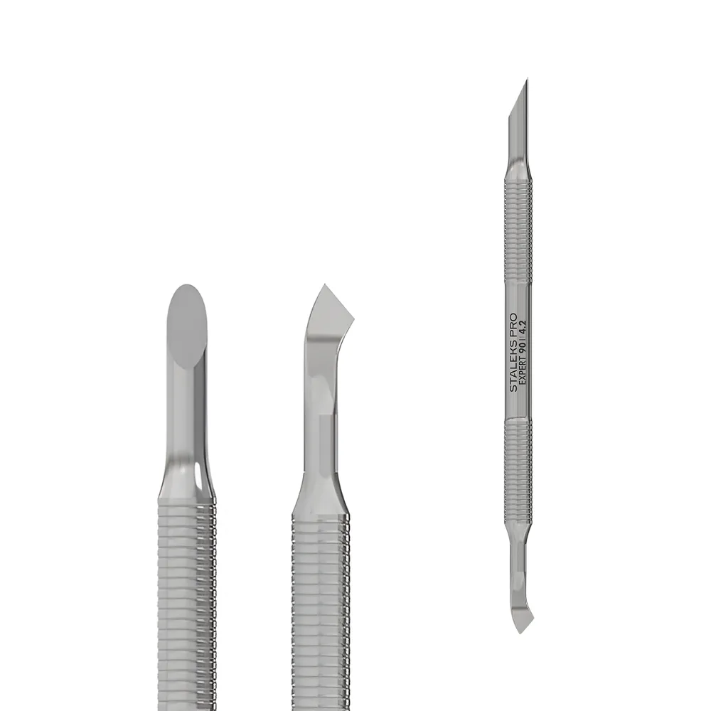 Пушер копитце та лопасть EXPERT 90 TYPE 4.2 поєднує дві функціональні частини: Робоча поверхня з відмінним ручним заточуванням ефективно справляється зі щільною шкіркою, не пошкоджуючи нігтьову пластину. Цей інструмент виконаний з цілісного металевого полотна, що виключає ризик розхитування деталей чи поломки кріплень. Належить до професійної серії EXPERT, тому підходить для всіх видів стерилізації і дезінфекції, необхідних у салонних умовах. Особливості продукту: Лопатка манікюрна EXPERT 90 TYPE 4.2 STALEKS PROЛопатка манікюрна EXPERT 90 TYPE 4.2 STALEKS PRO