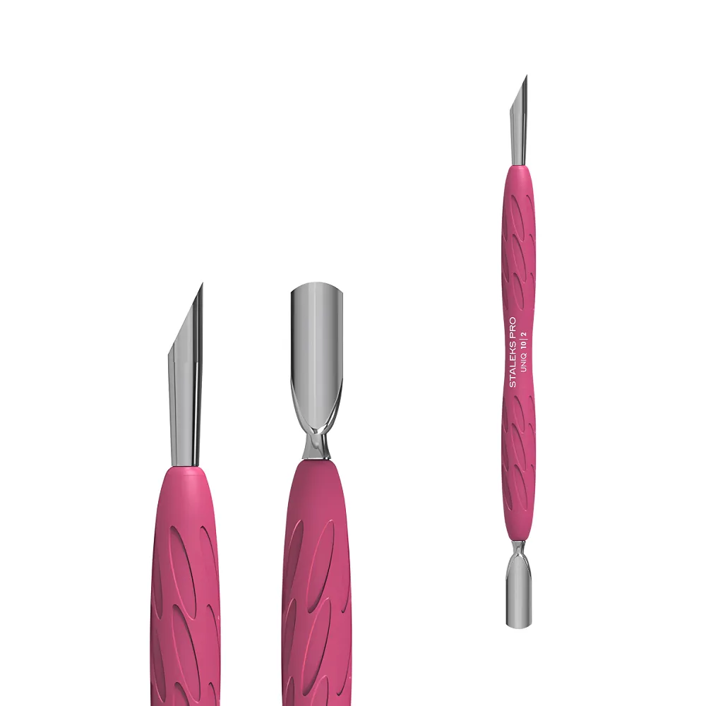 Лінійка інструментів UNIQ GUMMY поєднує ергономіку, бездоганну точність та естетичний дизайн. Виготовлені з високоякісної сталі з матовим покриттям, вони доповнені яскраво-рожевими силіконовими ручками, що надають особливої роботі зручності. Оснащений двома робочими зонами: За формою виглядає як металева апельсинова паличка. Завдяки увігнутій формі інструмент щільно прилягає до нігтьової пластини, ефективно та акуратно піднімає кутикулу. Продумана форма силіконової ручки з анатомічними виїмками рівномірно розподіляє тиск і не ковзає в руці. Пушер PQ-10/2 виконаний з цілісного металевого полотна, без ризику розхитування та поломки. Особливості продукту: Лопатка манікюрна Gummy з силіконовою ручкою UNIQ 10 TYPE 2 STALEKS PROЛопатка манікюрна Gummy з силіконовою ручкою UNIQ 10 TYPE 2 STALEKS PRO