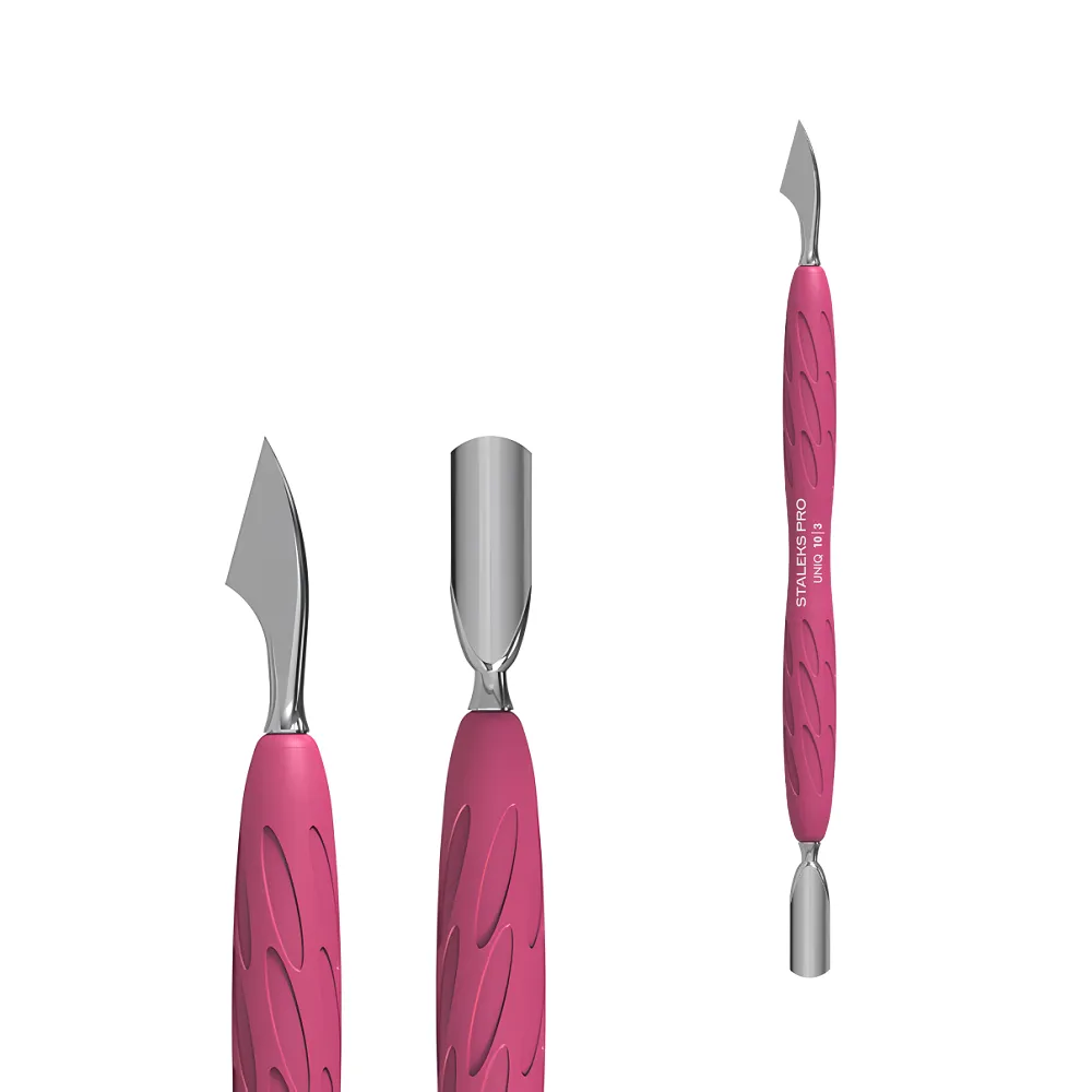 Лінійка інструментів UNIQ GUMMY поєднує ергономіку, бездоганну точність та естетичний дизайн. Виготовлені з високоякісної сталі з матовим покриттям, вони доповнені яскраво-рожевими силіконовими ручками, що надають особливої роботі зручності. Оснащений двома робочими зонами: Продумана форма силіконової ручки з анатомічними виїмками рівномірно розподіляє тиск і не ковзає в руці. Пушер PQ-10/3 виконаний з цілісного металевого полотна, без ризику розхитування та поломки. Особливості продукту: Лопатка манікюрна Gummy з силіконовою ручкою UNIQ 10 TYPE 3 STALEKS PROЛопатка манікюрна Gummy з силіконовою ручкою UNIQ 10 TYPE 3 STALEKS PRO