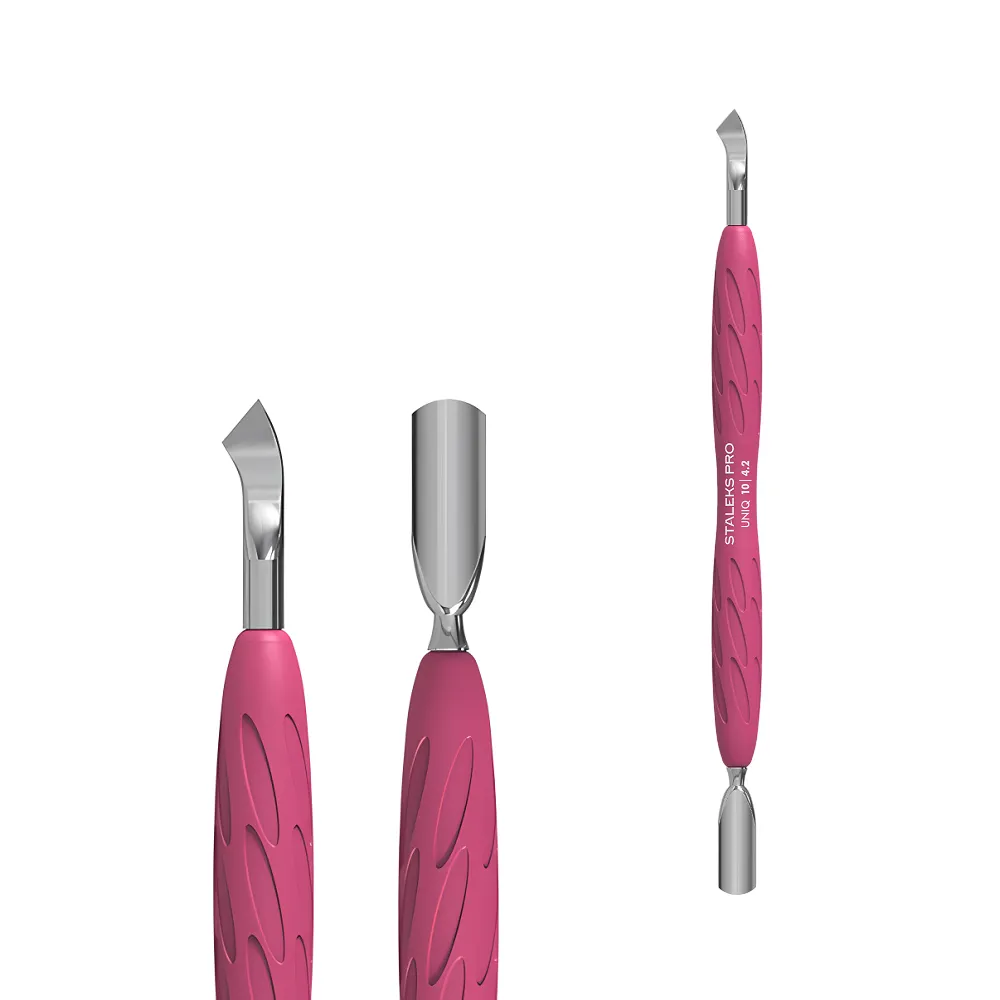 Лінійка інструментів UNIQ GUMMY поєднує ергономіку, бездоганну точність та естетичний дизайн. Виготовлені з високоякісної сталі з матовим покриттям, вони доповнені яскраво-рожевими силіконовими ручками, що надають особливої роботі зручності. Оснащений двома робочими зонами: Продумана форма силіконової ручки з анатомічними виїмками рівномірно розподіляє тиск і не ковзає в руці. Пушер PQ-10/4.2 виконаний з цілісного металевого полотна, без ризику розхитування та поломки. Особливості продукту: Лопатка манікюрна Gummy з силіконовою ручкою UNIQ 10 TYPE 4.2 STALEKS PROЛопатка манікюрна Gummy з силіконовою ручкою UNIQ 10 TYPE 4.2 STALEKS PRO