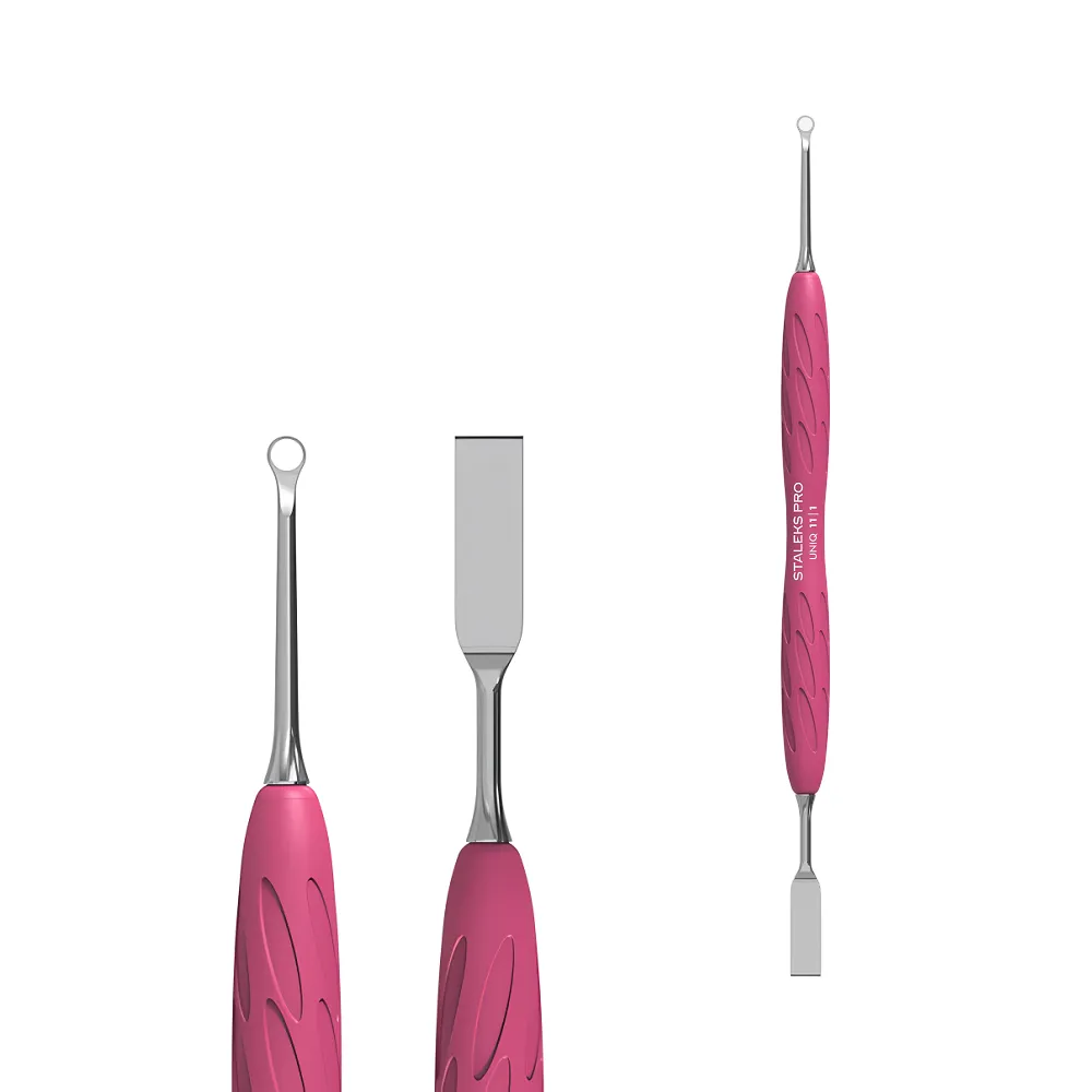 Лінійка інструментів UNIQ GUMMY поєднує ергономіку, бездоганну точність та естетичний дизайн. Виготовлені з високоякісної сталі з матовим покриттям, вони доповнені яскраво-рожевими силіконовими ручками, що надають особливої роботі зручності. Оснащений двома робочими зонами: Продумана форма силіконової ручки з анатомічними виїмками рівномірно розподіляє тиск і не ковзає в руці. Пушер PQ-11/1 виконаний з цілісного металевого полотна, без ризику розхитування та поломки. Особливості продукту: Лопатка манікюрна Gummy з силіконовою ручкою UNIQ 11 TYPE 1 STALEKS PROЛопатка манікюрна Gummy з силіконовою ручкою UNIQ 11 TYPE 1 STALEKS PRO