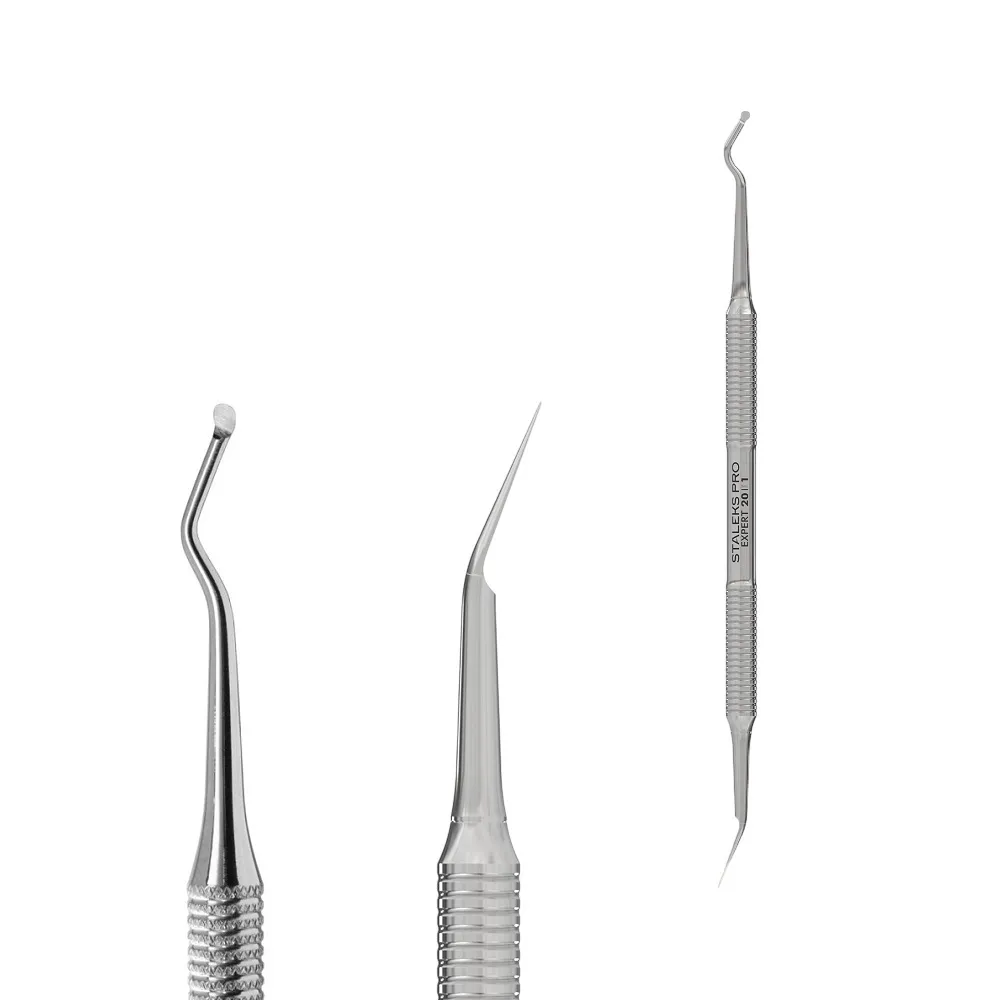 Цей професійний інструмент PE-20/1 допомогає у процесі здійснення процедури необрізного педикюру. Кюретка призначена для часткового видалення сухих мозолів та легко підчищає піднігтьовий і навколонігтьовий простір від забруднень. Для більш ефективної роботи інструмент виготовлений з двома робочими частинами. Легко дезінфікується в будь-яких відповідних розчинах, може піддаватися термічній обробці. Особливості продукту: Лопатка педикюрна EXPERT 20 TYPE 1 STALEKS PROЛопатка педикюрна EXPERT 20 TYPE 1 STALEKS PRO