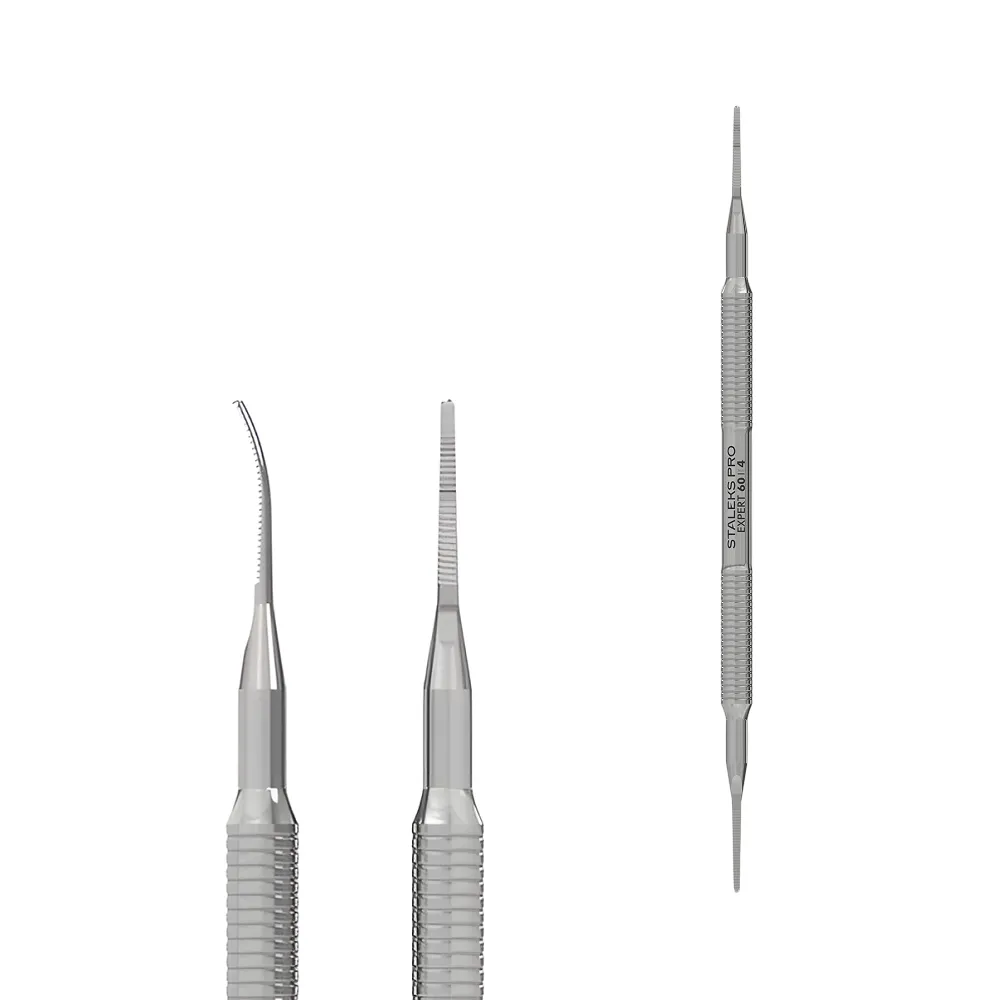 Рашпіль педикюрний EXPERT 60 TYPE 4 поєднує дві функціональні частини: пилка тонка пряма + пилка тонка із загнутим кінцем, які призначені для роботи з врослим нігтем. Вигнутою і рівною пилкою нескладно підчепити і підпиляти ніготь. Завдяки оптимальному заточуванню робоча поверхня ефективно впорається зі щільною нігтьовою пластиною без пошкоджень шкіри. Цей інструмент виконаний з цілісного металевого полотна, що виключає ризик розхитування деталей чи поломки кріплень. Належить до професійної серії EXPERT, тому підходить для всіх видів стерилізації і дезінфекції, необхідних у салонних умовах. Особливості продукту: Лопатка педикюрна EXPERT 60 TYPE 4 STALEKS PROЛопатка педикюрна EXPERT 60 TYPE 4 STALEKS PRO