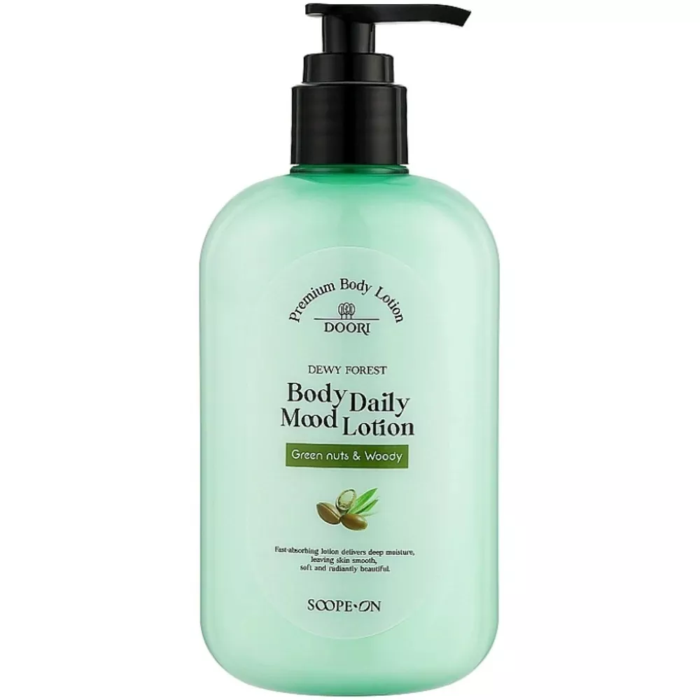 Екстракти цілющих трав центели азійської та хаутюнії серцеподібної, заспокоюють шкіру, пом`якшують та зволожують її. Лосьйон для тіла з екстрактами трав та зеленим горіхом для глибокого зволоження шкіри Body Daily Mood Lotion Green Nuts&Woody Dewy Forest DOORI