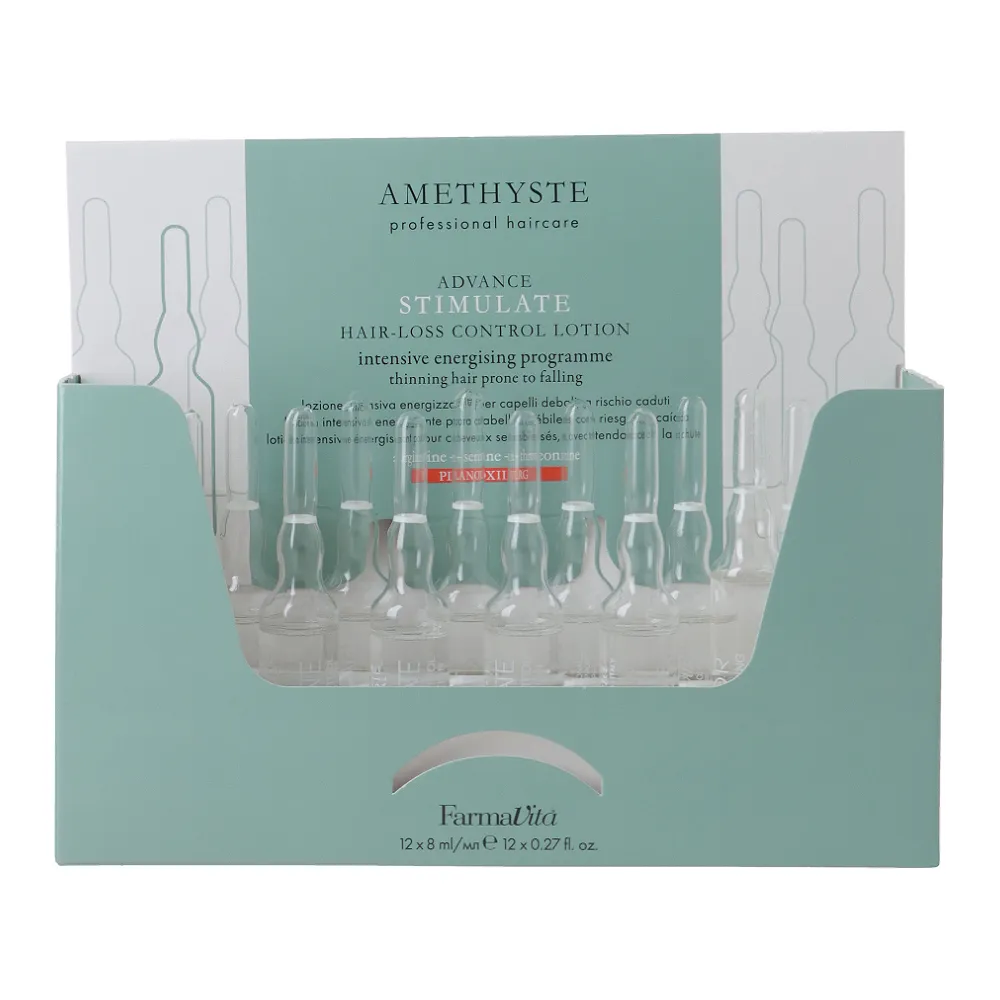Лосьон Hair-Loss Control Lotion ADVANCE STIMULATE AMETHYSTE це програма для слабкого волосся, схильного до випадіння. Формула з Planoxil RG+, аргініном, серином та треоніном має виражений стимулювальний ефект на шкіру голови, активізує мікроциркуляцію, покращує живлення фолікулів. Засіб сприяє зміцненню волосся, відновлює його щільність, об’єм і життєву силу. Підтримує здоровий цикл росту, покращує глибину та розмір волосяних фолікулів. Завдяки інноваційним активним компонентам забезпечує регулярний ріст волосся на 25%. Особливості продукту: Лосьйон для стимулювання росту волосся, 12*8 мл Hair-Loss Control Lotion ADVANCE STIMULATE AMETHYSTE FarmaVita Застосування: Лосьйон для стимулювання росту волосся, 12*8 мл Hair-Loss Control Lotion ADVANCE STIMULATE AMETHYSTE FarmaVita Використовувати: Лосьйон для стимулювання росту волосся, 12*8 мл Hair-Loss Control Lotion ADVANCE STIMULATE AMETHYSTE FarmaVita Після 8-11 тижнів інтенсивної програми переходьте до підтримки.Лосьйон для стимулювання росту волосся Hair-Loss Control Lotion ADVANCE STIMULATE AMETHYSTE FarmaVita