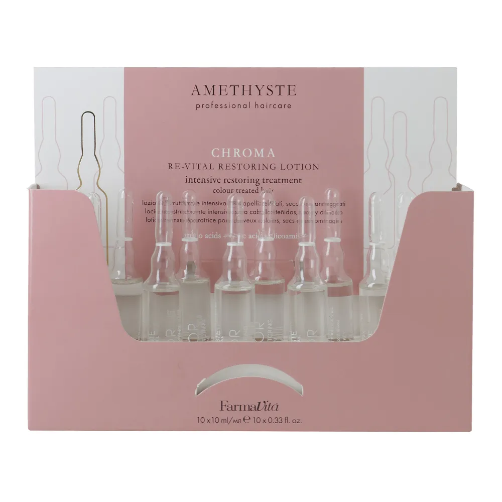 Лінія CHROMA це останнє та найінноваційніше рішення для догляду за всіма типами фарбованого волосся. Лосьйон Re-vital Restoring Lotion CHROMA AMETHYSTE це високоефективне концентроване лікування з амінокислотами, молочною кислотою та глікоаміном. Забезпечує подвійний результат: глибоке відновлення структури волосся та надійний захист кольору. Розроблений для збереження насиченості та блиску кольору після фарбування. Особливості продукту: Лосьйон інтенсивний відновлювальний для фарбованого волосся, 10*10 мл Re-vital Restoring Lotion CHROMA AMETHYSTE FarmaVita Застосування: Лосьйон інтенсивний відновлювальний для фарбованого волосся, 10*10 мл Re-vital Restoring Lotion CHROMA AMETHYSTE FarmaVita Нанести на вологе волосся, рівномірно розподілити, залишити на 5-10 хвилин, ретельно змити. При додаванні води перетворює лосьйон в кремову емульсію.Лосьйон інтенсивний відновлювальний для фарбованого волосся Re-vital Restoring Lotion CHROMA AMETHYSTE FarmaVita