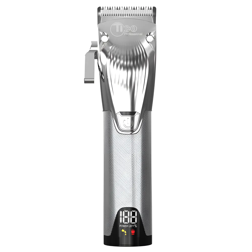 Машинка для стрижки волосся TICO Professional Pro Expert Maxi 100413 Silver представляє собою відмінну професійну модель з сучасними дизайном і технологіями. Це бездротова машинка з прекрасними можливостями і хорошим функціоналом, яка випускається в двох кольорах - сріблястому і золотистому. Модель оснащена ножовим блоком з якісної нержавіючої сталі стандартною шириною 46 мм. (мінімальний зріз волосся становить 0.5 мм.). Ножі встановлені на спеціальному механізмі, який дозволяє плавно змінювати довжину зрізу волосся від 0.5 до 2 мм. Таким чином, майстер зможе легко створювати дуже плавні переходи та фейди без «сходинок». При використанні будь-якої насадки, Ви так само зможете збільшити довжину зрізу на 2 мм, тому, кількість налаштувань довжини зрізу волосся дуже велика. Може бути використана як для роботи, так і для навчання або ж домашньої стрижки. Машинка має інтелектуальне управління з LCD дисплеєм, на якому виводитися вся необхідна інформація: розрахунковий час роботи машинки від акумулятора, індикатор зарядки, індикатор необхідності змащення ножів і ексцентрика мотора. Працює машинка від вбудованого Li-Ion акумулятора, при необхідності, машинку можна підключити до адаптера живлення і завершити роботу, одночасно заряджаючи її. Машинка виконана в металевому корпусі, який додає моделі елегантності і дорожнечі. Незважаючи на металевий корпус модель дуже легка - 285 грам, що, безумовно, сподобається будь-якому майстрові, оскільки модель в роботі буде дуже легкою. Особливості товару: Машинка для стрижки Pro Expert Maxi 100413SIL TICO Professional В комплекті: Машинка для стрижки Pro Expert Maxi 100413SIL TICO Professional Умови гарантії: Машинка для стрижки Pro Expert Maxi 100413SIL TICO Professional