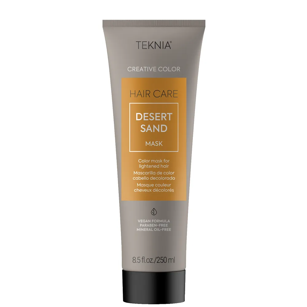 Маска DESERT SAND MASK інтенсивно відновлює структуру волосся, запобігає втраті пігменту і допомагає надовго зберегти яскравість та інтенсивність кольору. Формула засобу збагачена органічним екстрактом какао, що відрізняється своїми антиоксидантними властивостями. Це додатково захищає локони від негативного впливу зовнішніх факторів, UV-променів і стресу. Має свіжий аромат з ефірною олією лимону. Особливості продукту: Активні компоненти: Застосування: ретельно нанести на вимите та підсушене рушником волосся, залишити мінімально на 5-10 хвилин (в залежності від бажаного результату), змити. Рекомендуємо надягати рукавички.Маска для оновлення кольору освітленого волосся (пісочна) DESERT SAND MASK Creative Color TEKNIA LAKME
