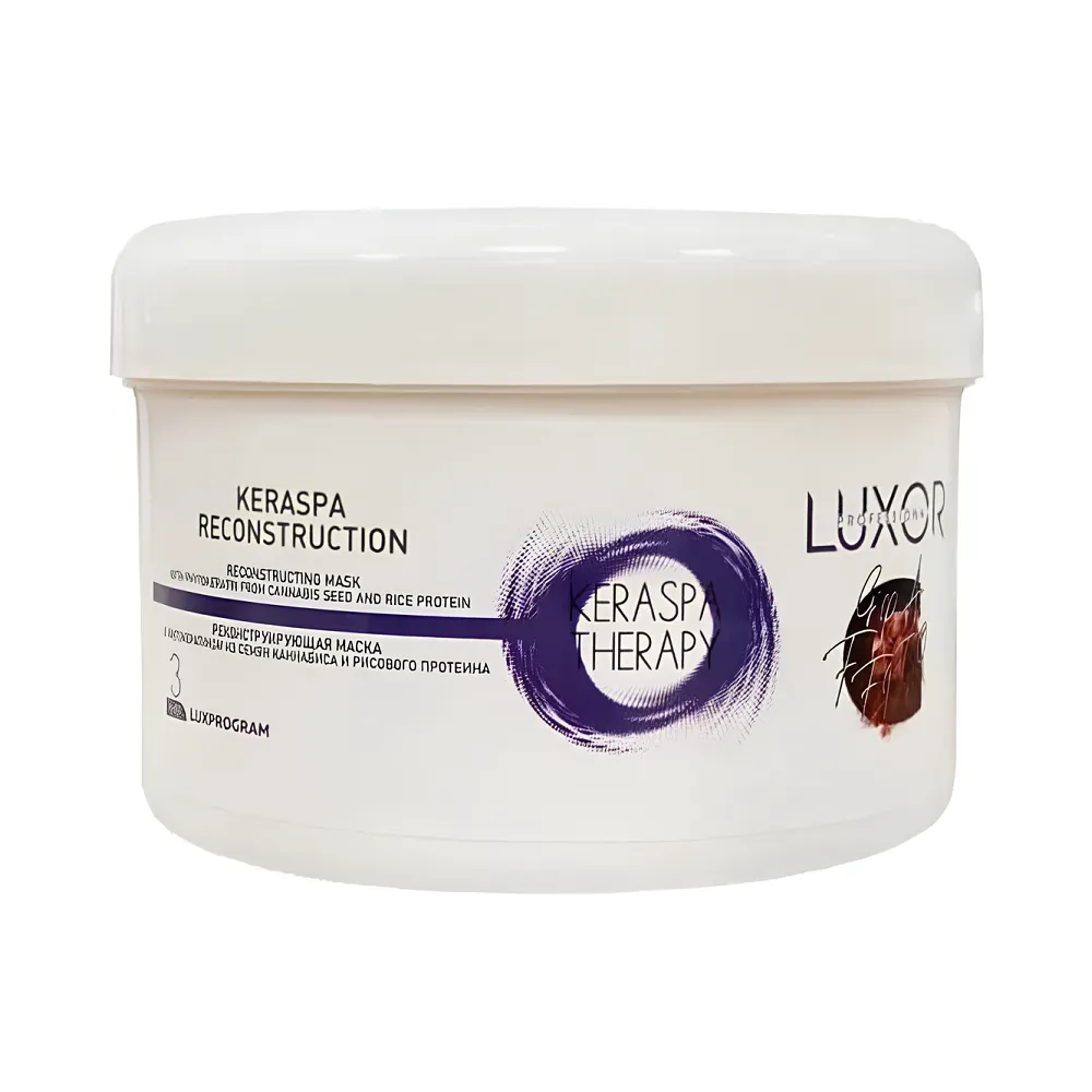 Відновлююча маска KERASPA RECONSTRUCTION для реконструкції пошкодженого, сухого та ламкого волосся. Гідролізований кератин, що входить до складу, реставрує і зміцнює структуру волосся, робить його здоровим, щільним і об`ємним. Катіонні полімери вирівнюють структуру волосся, згладжують кінці, що січуться, і захищають їх від впливу високих температур. Пантенол зволожує волосся, відновлюючи гідробаланс, надає блиску, еластичності та шовковистості. Особливості продукту: Активні компоненти: фітокератин із гідролізованого екстракту насіння конопель та рисового протеїну, пантенол. Застосування: У процедурі KeraSpa Therapy: Домашній догляд за волоссям:Маска для реконструкції з фітокератином і рисовим протеїном (фаза 3) KERASPA RECONSTRUCTION Keraspa Therapy LUXOR Professional