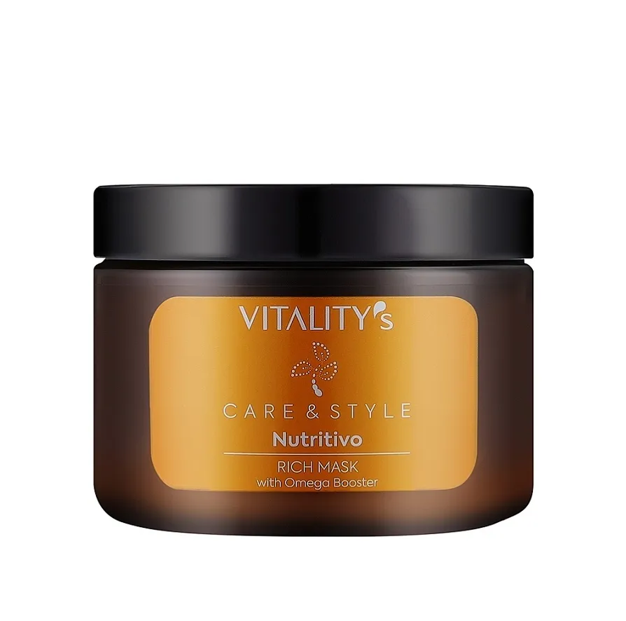 З надзвичайно багатим рослинним складом, для потужного живлення та полегшення розчісування волосся. Насичена текстура надає м’якості та блиску не обтяжуючи волосся і надаючи йому неймовірної шовковистості. Особливості продукту: V.E.G. Mix зі зволожуючими і антиоксидантними властивостями; омега бустер багатий омега-жирними кислотами 3, 6 і 9, глибоко зволожує і живить волокна волосся; гідролізовані рисові протеїни рослинного походження; антистатик; Quaterium 87 надає блиск волоссю. Застосування: нанесіть на вимите і підсушене рушником волосся по всій довжині і на кінчики, залишіть на 5-10 хвилин. Розчешіть та змийте.Маска для сухого або дуже чутливого волосся Rich Mask Nutritivo Care&Style Vitality`s