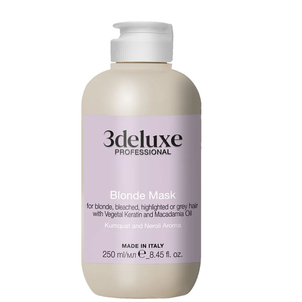 Маска з кератином і олією макадамії Blonde Mask живить, зволожує, надає гладкість. Допомагає зберегти відтінок блонд насиченим та яскравим, забезпечує шовковистість і блиск. Засіб має приємний аромат кумквату й неролі. Особливості продукту: Застосування: після миття шампунем нанесіть на підсушене рушником волосся та розчешіть, залиште на 5-10 хвилин, змийте.Маска для світлого, освітленого та сивого волосся з кератином і олією макадамії Blonde Mask 3deluxe Professional