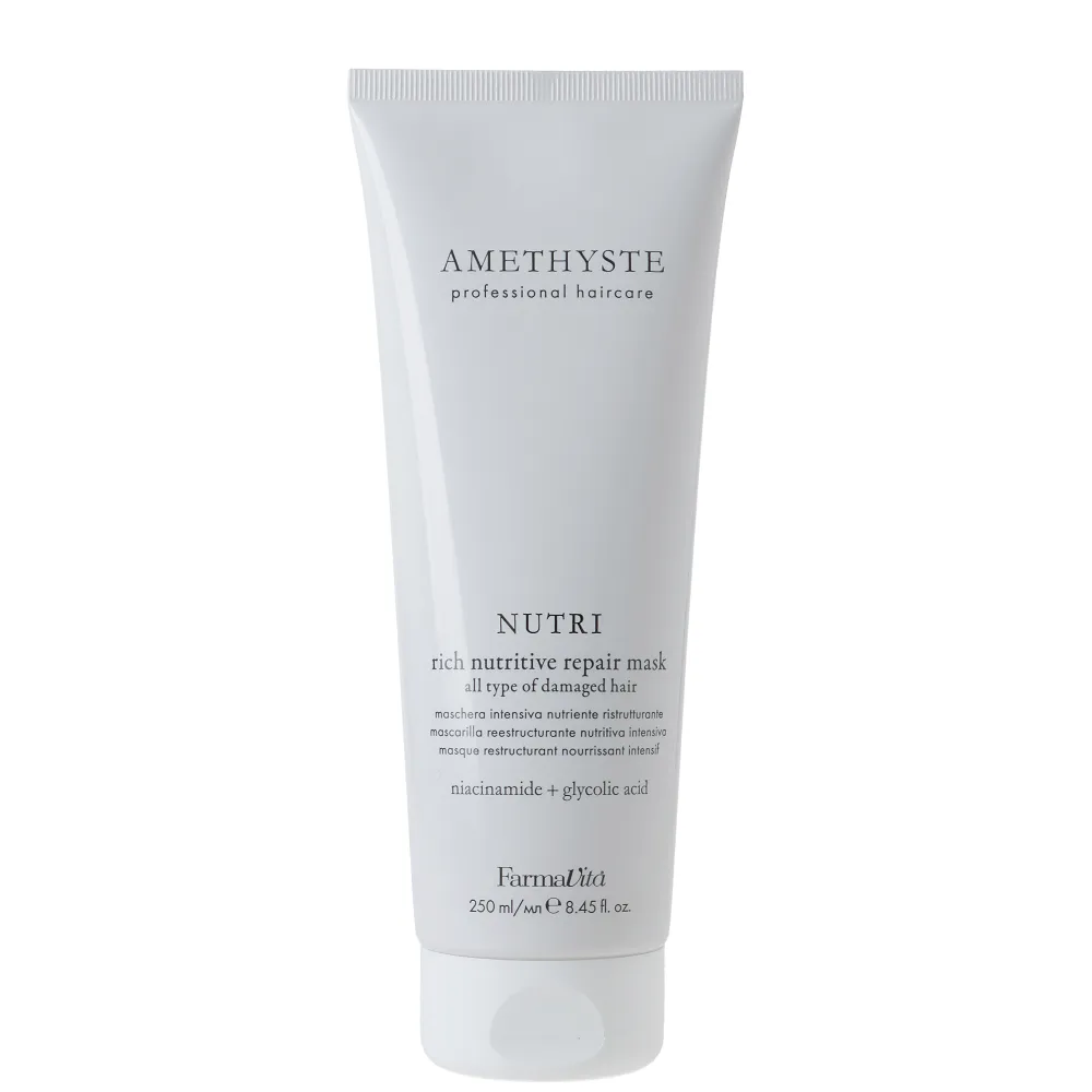 Інтенсивна відновлювальна маска Rich Nutritive Repair Mask NUTRI AMETHYSTE з глибоким живленням. Професійна формула для глибокої реконструкції всіх типів пошкодженого волосся. Завдяки комбінації ніацинамідом та гліколевою кислотою маска інтенсивно живить, зміцнює структуру, зменшує ламкість і відновлює пошкоджені ділянки по всій довжині. Волосся стає м’яким, гладеньким і більш блискучим - без ефекту обтяження. Особливості продукту: Маска для відновлення та живлення пошкодженого волосся, 250 мл Rich Nutritive Repair Mask NUTRI AMETHYSTE FarmaVita Застосування: Маска для відновлення та живлення пошкодженого волосся, 250 мл Rich Nutritive Repair Mask NUTRI AMETHYSTE FarmaVita Після шампуню нанесіть маску на вологе волосся, рівномірно розподіліть за допомогою гребінця, залиште на 5 хвилин, потім ретельно змийте. Рекомендовано для регулярного салонного та домашнього догляду.Маска для відновлення та живлення пошкодженого волосся Rich Nutritive Repair Mask NUTRI AMETHYSTE FarmaVita