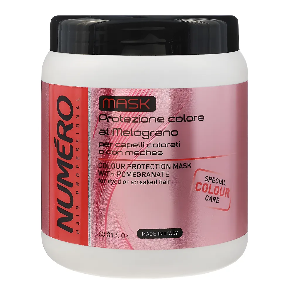 Маска Colour Numero з екстрактом граната, вітаміном С, вітаміни групи В, високим вмістом антиоксидантних поліфенолів призначений для використання на фарбованому волоссі. Всі ці компоненти забезпечують волоссю надійний захист кольору. Захищає волосся від вигорання і впливу зовнішніх негативних чинників, надовго зберігає інтенсивність і яскравість кольору. Маска не обтяжує волосся. Особливості продукту: Маска для захисту кольору фарбованого волосся з екстрактом граната, 1000 мл Colour Protection Mask with Pomegranate Colour Numero BRELIL Professional Активні компоненти: Маска для захисту кольору фарбованого волосся з екстрактом граната, 1000 мл Colour Protection Mask with Pomegranate Colour Numero BRELIL Professional Застосування: Маска для захисту кольору фарбованого волосся з екстрактом граната, 1000 мл Colour Protection Mask with Pomegranate Colour Numero BRELIL Professional Масажними рухами нанести невелику кількість маски на вимите шампунем волосся по всій довжині, приділить увагу найбільш ушкодженим місцям. Залишити маску на волоссі на кілька хвилин, після чого ретельно змити водою.Маска для захисту кольору фарбованого волосся з екстрактом граната Colour Protection Mask with Pomegranate Colour Numero BRELIL Professional