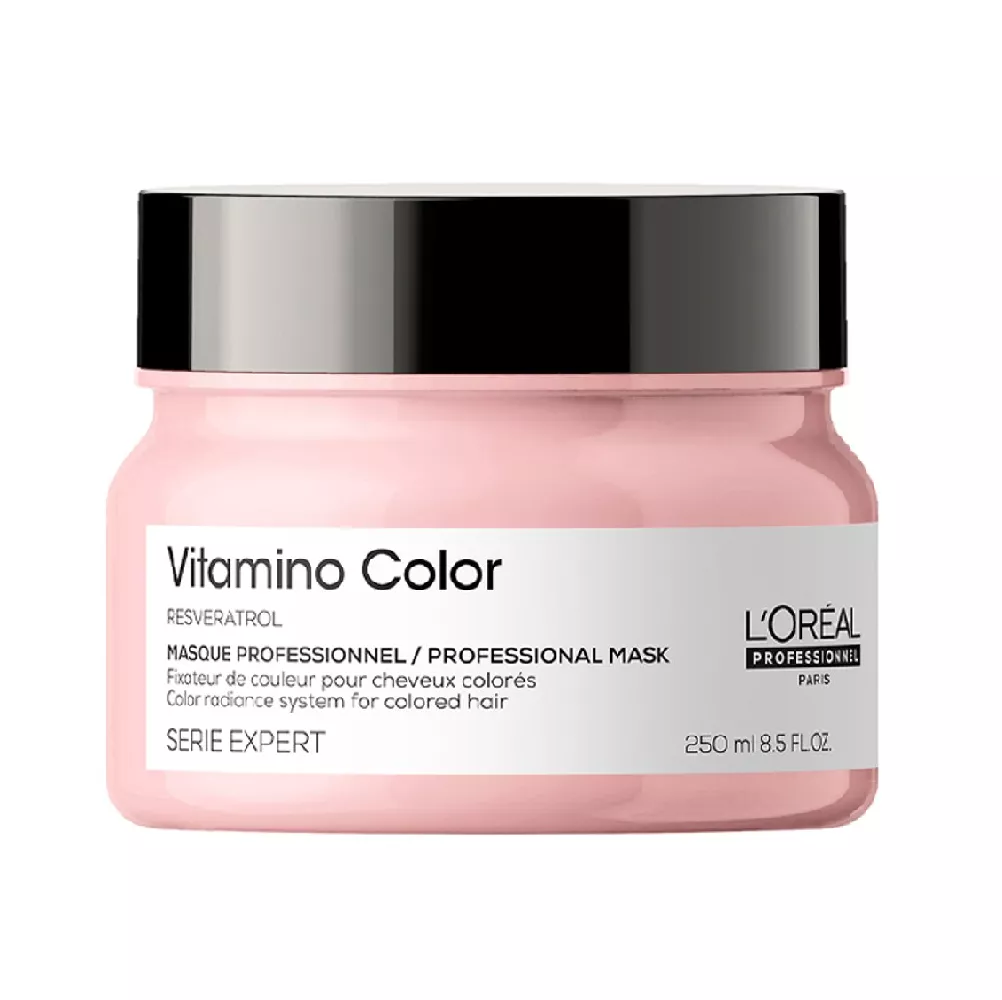 Професійна формула маски Serie Expert Vitamino Color містить ресвератрол - природний поліфенол, отриманий з шкірки ягід винограду, який захищає колір фарбованого волосся від вимивання, а також волокно волосся від зовнішніх пошкоджень. Маска живить волосся, робить його сильнішими і м`якими всього через 1 хвилину. Вона має ультрапоживну формулу, яка дарує волоссю насичений блиск, робить його сильним та м’яким. Особливості продукту: Застосування: вимийте волосся шампунем Vitamino Color, нанесіть маску на віджате рушником волосся. Витримайте 5-10 хвилин, ретельно змийте водою. Порада Для кращого ефекту рекомендується використовувати всю лінійку L’Oreal Professionnel Serie Expert Vitamino Color. Маска для захисту та збереження кольору фарбованого волосся, 250мл Mask Vitamino Color Serie Expert L`Oreal Professionnel