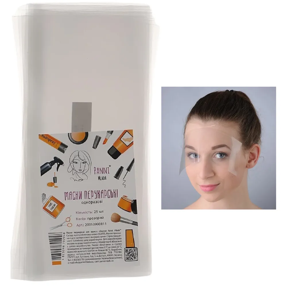 Маска розроблена для використання в перукарнях і салонах краси. Виготовлена з прозорої плівки, вона забезпечує ефективний захист обличчя клієнта від потрапляння волосся, хімічних засобів або води під час процедур. Особливості продукту: Кількість в упаковці: 25 штук, що робить маски економічним вибором для салонів краси та перукарень.Маска перукарська з поліпропіленової плівки для захисту обличчя під час стрижки Panni Mlada