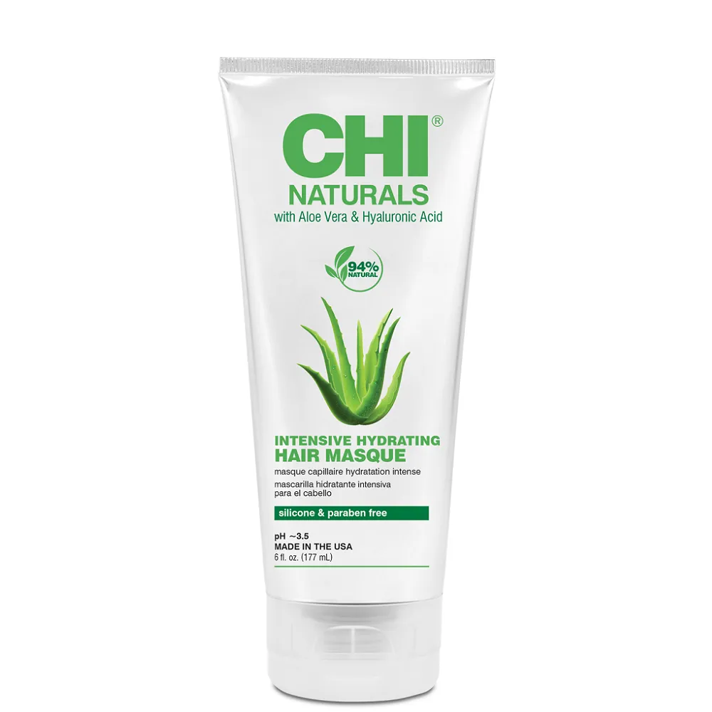 Інтенсивно зволожувальна маска для волосся Intensive Hydrating Hair Masque з алое та гіалуроновою кислотою живить і зміцнює волосся. Формула збагачена багатою органічною сумішшю, яка зміцнює та відновлює пошкоджене волосся та допомагає захистити волосся від нових пошкоджень. Надає текстурованому та хімічно обробленому волоссю оптимальне зволоження та життєву силу, роблячи волосся слухняним. Не містить силіконів та парабенів. Активні компоненти: Особливості продукту: Застосування: відразу після миття шампунем нанести невелику кількість маски на вологе волосся, масажними рухами розподілити по всій довжині волосся. Залишити на час від 3 до 10 хвилин, залежно від стану волосся. Ретельно промити.Маска зволожувальна для волосся з алоє вера та гіалуроновою кислотою Intensive Hydrating Hair Masque Naturals with Aloe Vera CHI