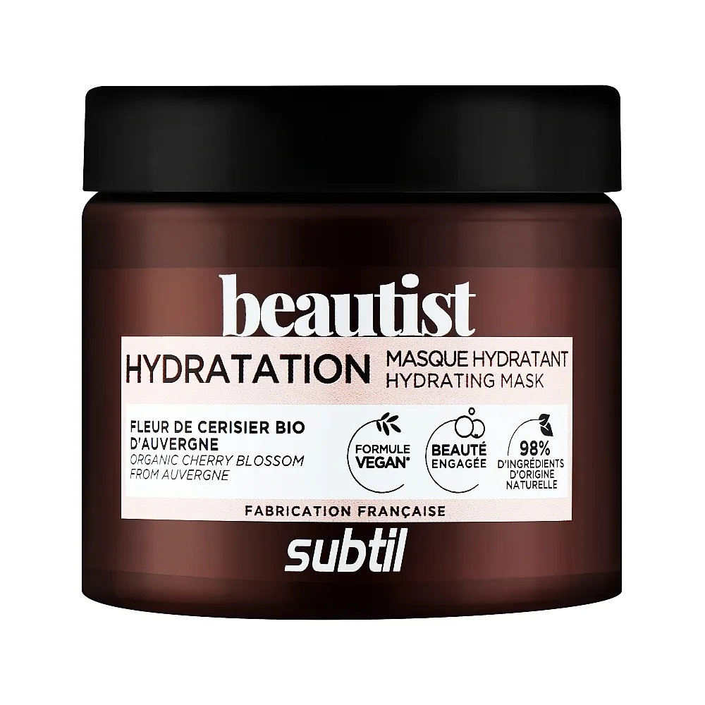 Зволожувальна маска Hydrating Mask розроблена для сухого і чутливого волосся. Маска збагачена корисними активними інгредієнтами рослинного походження, її формула являє собою ідеальну композицію для захисту волосся, а також для відновлення його м`якості та блиску. До складу входить 22 основних інгредієнтів для забезпечення ефективності та органолептики. Має ароматні ноти: мускусний, фруктовий, квітковий. Особливості продукту: Активні компоненти: Застосування: нанесіть маску на вимите і підсушене рушником волосся, залиште засіб на 5 хвилин, ретельно промийте волосся.Маска зволожувальна з екстрактом вишневого цвіту Hydrating Mask HYDRATATION Beautist Subtil