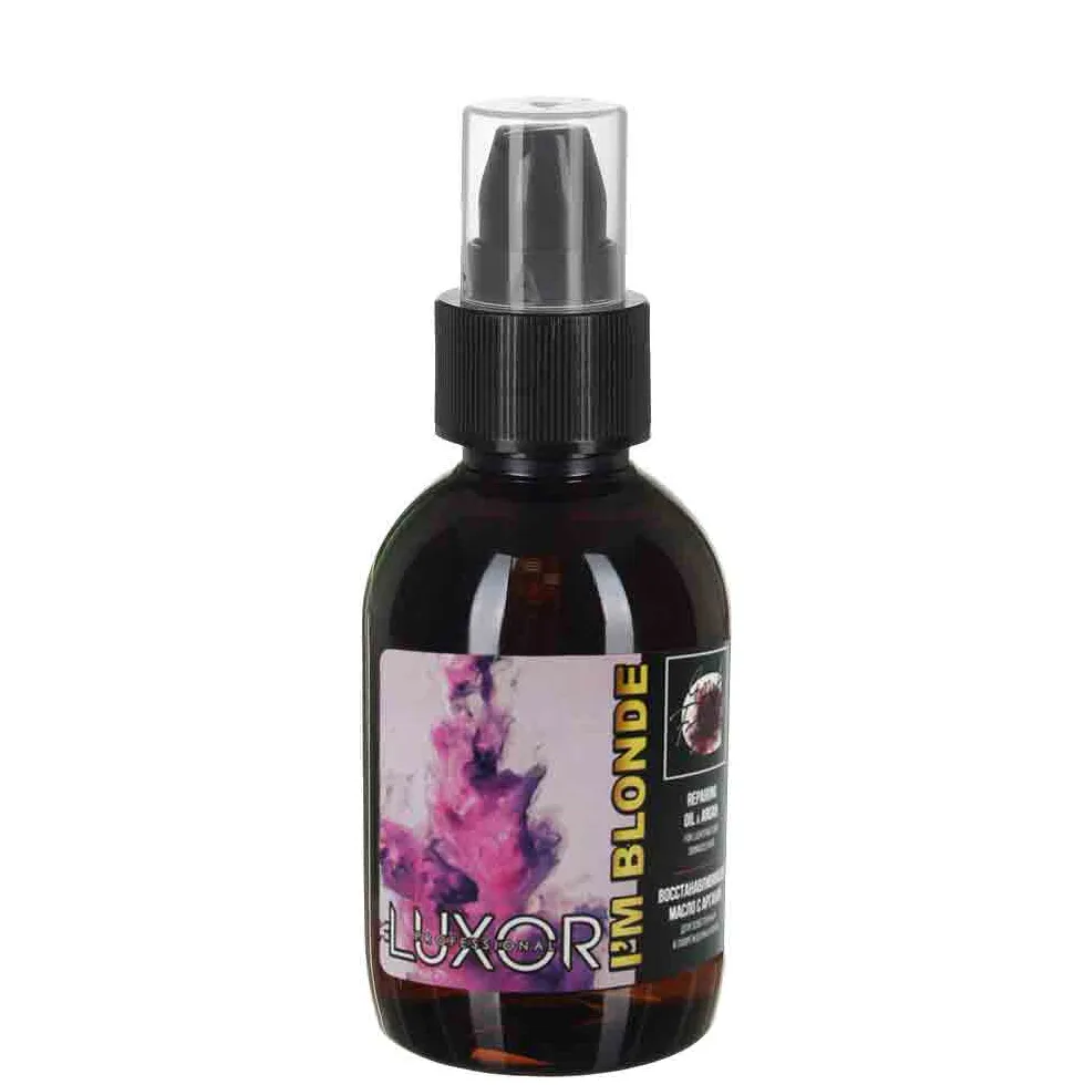 Масло Repairing Oil & Argan I`M BLONDE для щоденного догляду за сухим волоссям кольору блонд, ефективно зволожує волосся, підвищуючи стійкість до зовнішніх негативних впливів. Покращує структуру, відновлює посічені кінчики волосся та попереджає статичний ефект. Застосування олії щодня робить волосся блискучим, забезпечуючи надзвичайний шовковистий ефект. Особливості продукту: Активні компоненти: олія аргану. Застосування: необхідну кількість олії розтерти в долонях, нанести на волосся, виконати укладання. Допускається наносити як на вологе, так і на сухе волосся.Масло відновлювальне з арганою для освітленого і пошкодженого волосся Repairing Oil & Argan I`M BLONDE LUXOR Professional