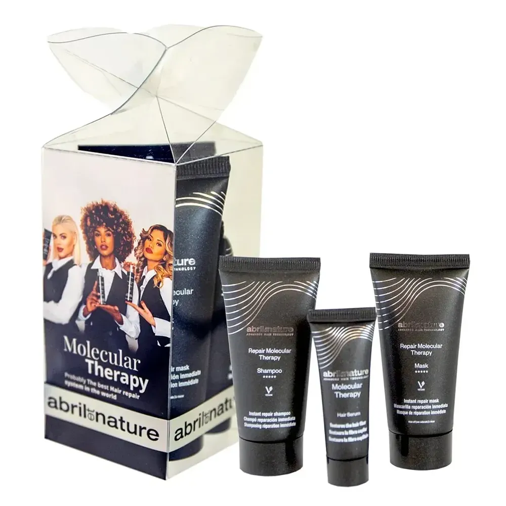 Склад набору: Шампунь для відновлення волосся на молекулярному рівні з гіалуроновою кислотою, 30 мл Repair Shampoo MOLECULAR THERAPY Abril et Nature; Маска для відновлення волосся на молекулярному рівні з гіалуроновою кислотою, 30 мл Repair Mask MOLECULAR THERAPY Abril et Nature; Сироватка для відновлення волосся на молекулярному рівні, 10 мл Hair Serum MOLECULAR THERAPY Abril et Nature. Молекулярна терапія MOLECULAR THERAPY Abril et Nature може допомогти пошкодженому або старому волоссю стати міцнішим і здоровішим, за натуральне волосся. Вже з першого застосування ви побачите помітне покращення та зміни текстури волосся. Ваше волосся стане сильнішим і здоровішим, з підвищеною стійкістю до ламкості, природним і блискучим виглядом. Особливості продукту: Застосування:Міні-набір для відновлення волосся на молекулярному рівні MOLECULAR THERAPY Abril et Nature