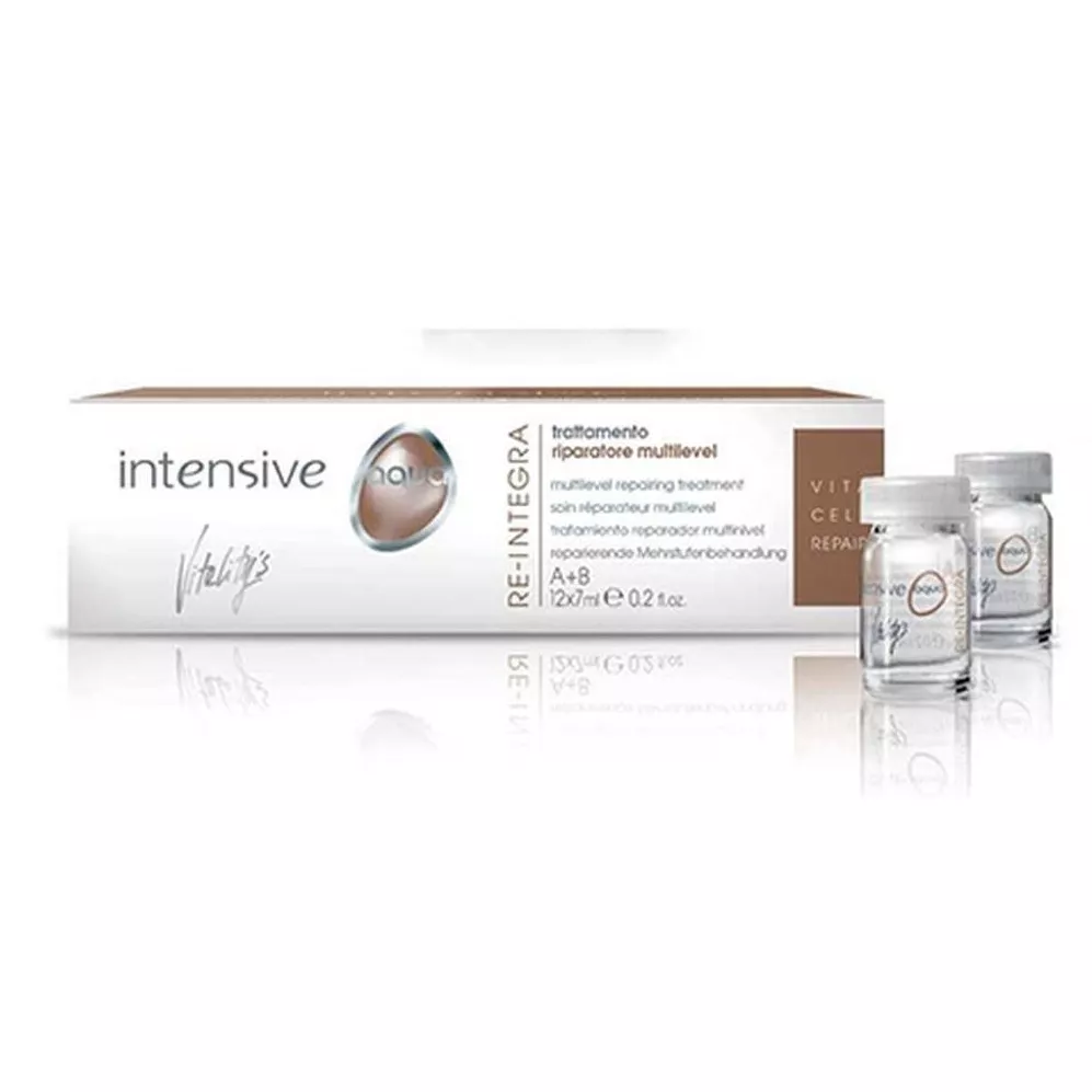 VITALITY`S Intensive Aqua Re-Integra Multilevel Reparing Treatment - Мультирівнева процедура відновлення Професійний регенеруючий комплекс для догляду за травмованими та виснаженими локонами. Оздоровлює структуру кутикулярного шару, активізує зростання здорового волосся. Спосіб застосування: Активні компоненти: D-пантенол, амінокислоти (аланін, валін, арганін), фруктові кислоти, кератин, керамід 2. Об`єм: 12 флаконів по 7 мл.