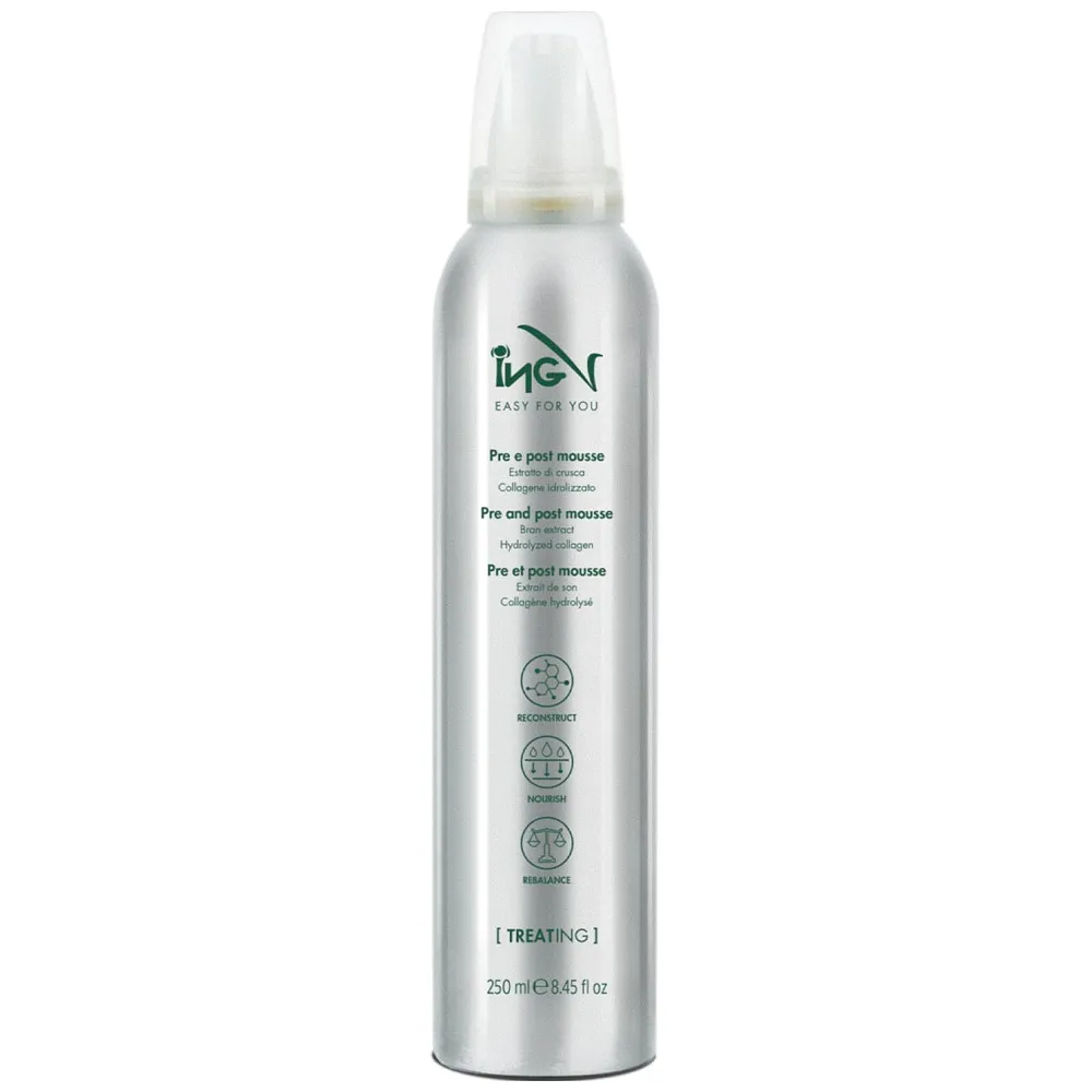 Мус Pre and post mousse Treating призначений для захисту перед проведенням хімічних процедур та для відновлення волосся після хімічних процедур. Особливо рекомендується до використання для слабкого, схильного до випадання, пофарбованого, пошкодженого, ламкого та хімічно обробленого волосся. Особливості продукту: Активні компоненти: Застосування: перед використанням збовтати флакон, перевернути та видавити необхідну кількість мусу, нанести на волосся, залишити на 3-5 хвилин. Ретельно промити теплою водою. Мус можна не змивати у разі використання перед хімічною обробкою.Мус для захисту та відновлення "До і після" процедур з колагеном Pre and post mousse Treating ING Professional
