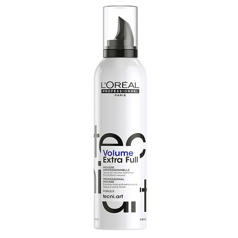 Мус для додання об`єму волоссю дуже сильної фіксації L`oreal Professionnel Volume Extra Mousse, завдяки аніонним та катіонним полімерам створює пишну та гарну укладку. Цей стайлінговий продукт підходить для роботи з різними видами волосся, навіть дуже тонкі пасма з ним стають об`ємними. Завдяки високому рівню фіксації, укладка збереже свій початковий вигляд, незважає на негативний вплив природних чинників (вітер, підвищена вологість, перепад температур тощо). Особливості продукту: Мус дуже сильної фіксації для надання об`єму волоссю, 250мл (Force 5) Volume Extra Full Mousse Tecni ART L’Oreal Professionnel Застосування: Мус дуже сильної фіксації для надання об`єму волоссю, 250мл (Force 5) Volume Extra Full Mousse Tecni ART L’Oreal Professionnel Добре струсіть вміст флакона та розітріть між долонями невелику кількість мусу. Розподіліть гребінцем або руками по волоссю, після чого починайте укладання за допомогою фена або надайте форму зачісці пальцями.Мус дуже сильної фіксації для надання об`єму волоссю (Force 5) Volume Extra Full Mousse Tecni ART L’Oreal Professionnel