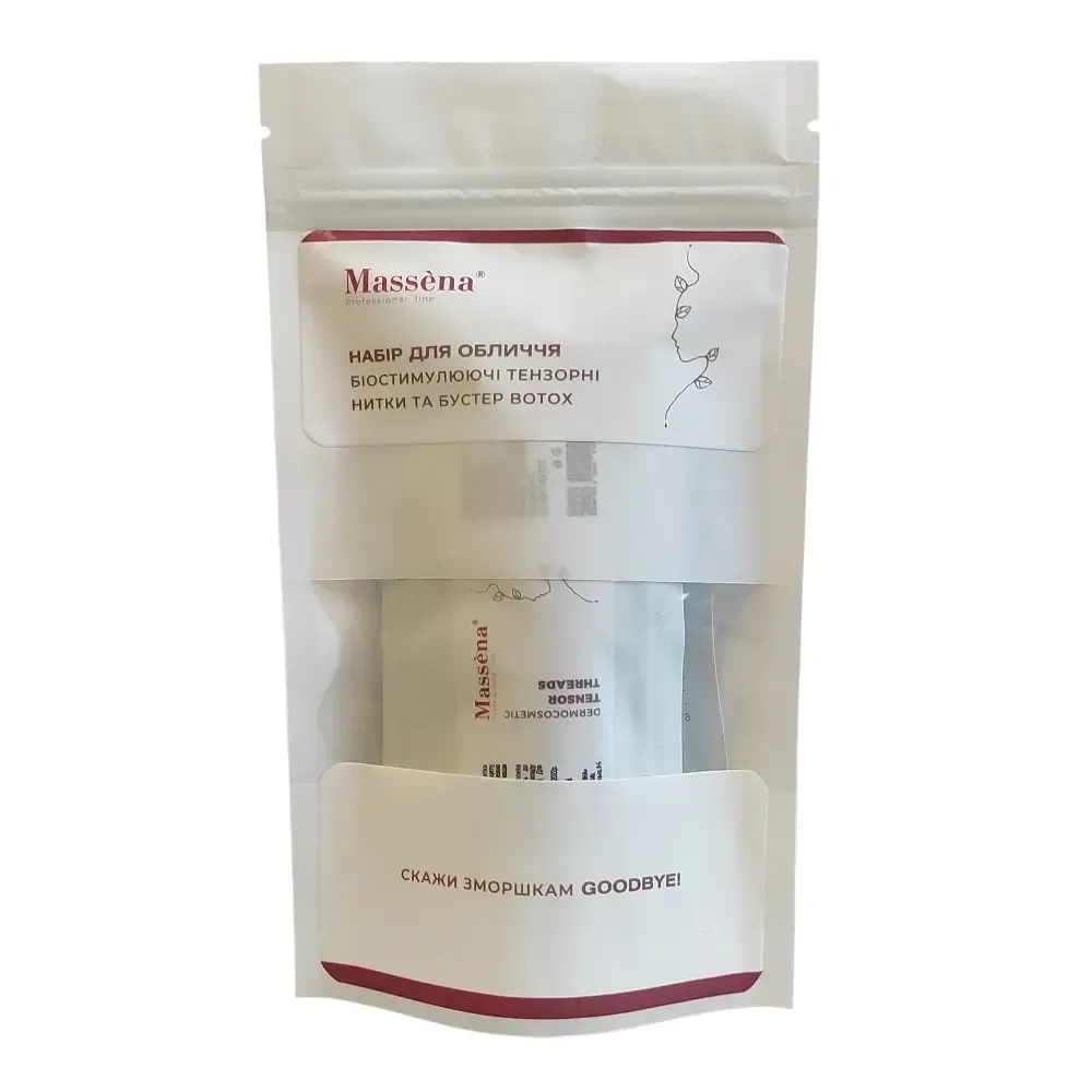 Процедура Lift Boost гарантує миттєвий і тривалий ефект наповнення шкіри, тонізує, надас еластичність, змінює овал обличчя, усуває в`ялість шкіри, протидіє появі зморшок та розгладжує вже наявні. Біостимулюючі тензорні нитки Face Tensor створені із шовкових волокон, гідролізованого колагену, рослинних протеїнів та олігопептидів. Нитки здатні проникати всередину епідермісу, стимулюють фібробласти до синтезу колагену та еластину, надають тонус та миттєвий ефект ліфтингу. Активно діють на зморшки, розгладжують тканини, при цьому надають шкірі зволоження, гладкість, яскравість та пружність. Спрей Botox Booster Activator з чистою гіалуроновою кислотою з молекулярною масою 5, колагеном та біопептидами діє як активатор і транспортний засіб, дозволяючи ниткам розчинятися та діяти на різні шари епідермісу. Особливості продукту: Набір для обличчя: біостимулюючі тензорні нитки та бустер Botox, 1 комплект + 10 мл Face Tensor Massena Активні компоненти: Набір для обличчя: біостимулюючі тензорні нитки та бустер Botox, 1 комплект + 10 мл Face Tensor Massena Застосування: Набір для обличчя: біостимулюючі тензорні нитки та бустер Botox, 1 комплект + 10 мл Face Tensor MassenaНабір для обличчя: біостимулюючі тензорні нитки та бустер Botox Face Tensor Massena