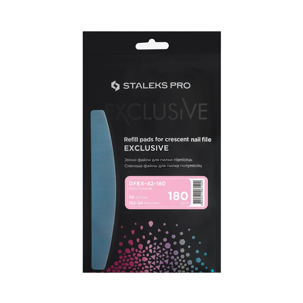 Комплект змінних абразивів Exclusive 42 створений для турботи про здоров`я клієнта та майстра, забезпечення гігієнічності та безпеки процедури манікюру та педикюру. Змінні файли розраховані на пилку-основу в формі півмісяць, вони не мають пінного шару та підлягають утилізації після кожного використання. Основу можна дезінфікувати з іншим інструментом. Це робить використання одноразових абразивів максимально безпечним для клієнта та майстра. Комфорт у роботі забезпечує високоякісний швейцарський абразив преміум класу, який довго зберігає свої властивості. Файли вологостійкі, не зміщуються, не розмокають, що забезпечує зручну роботу. Особливості продукту: Набір змінних файлів (50шт) для пилки півмісяць 180 грит EXCLUSIVE 42 (DFEX-42-180) STALEKS PRO Підходять для металевої (MBE-40) та акрилової (ABE-40) основ.Набір змінних файлів (50шт) для пилки півмісяць 180 грит EXCLUSIVE 42 (DFEX-42-180) STALEKS PRO